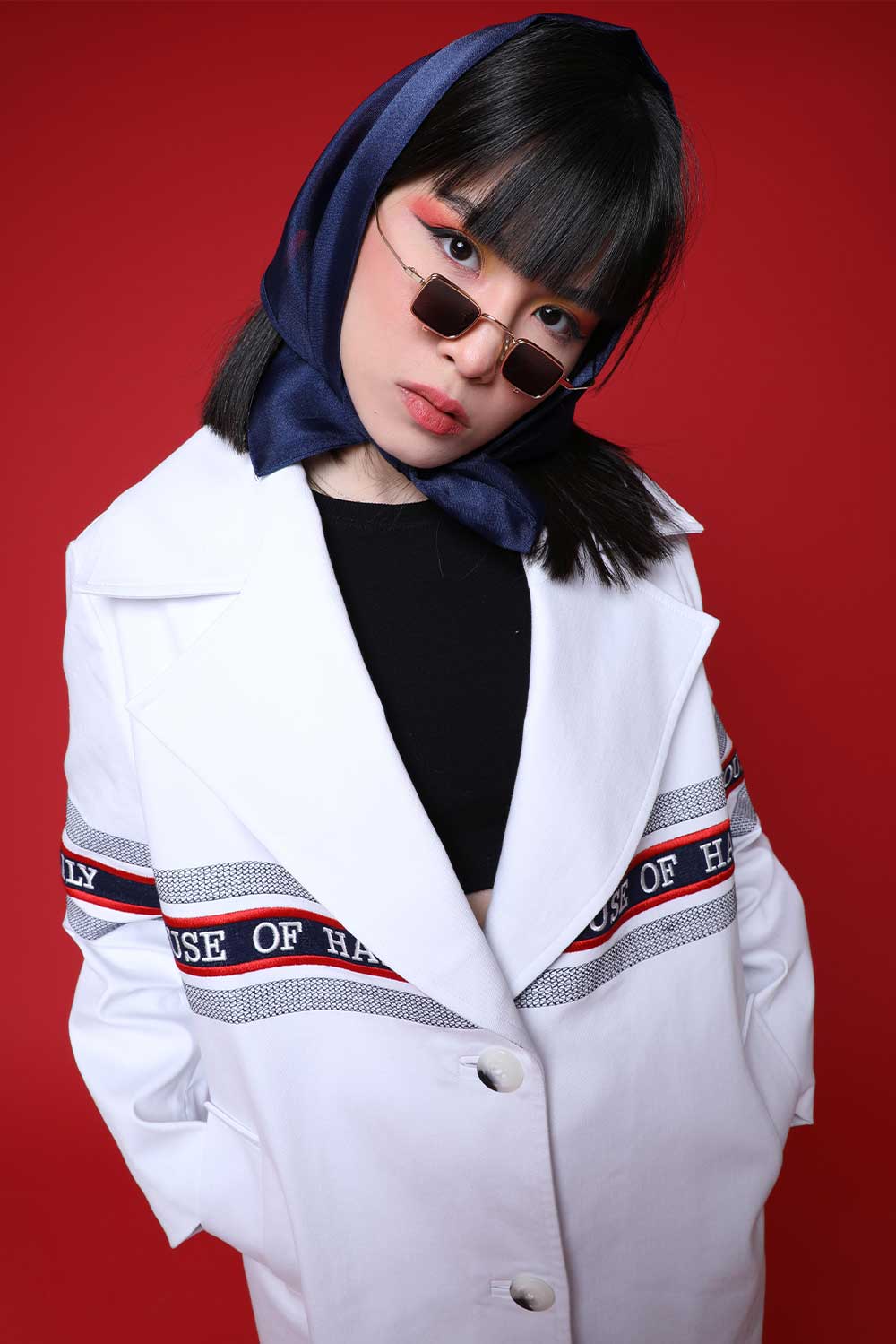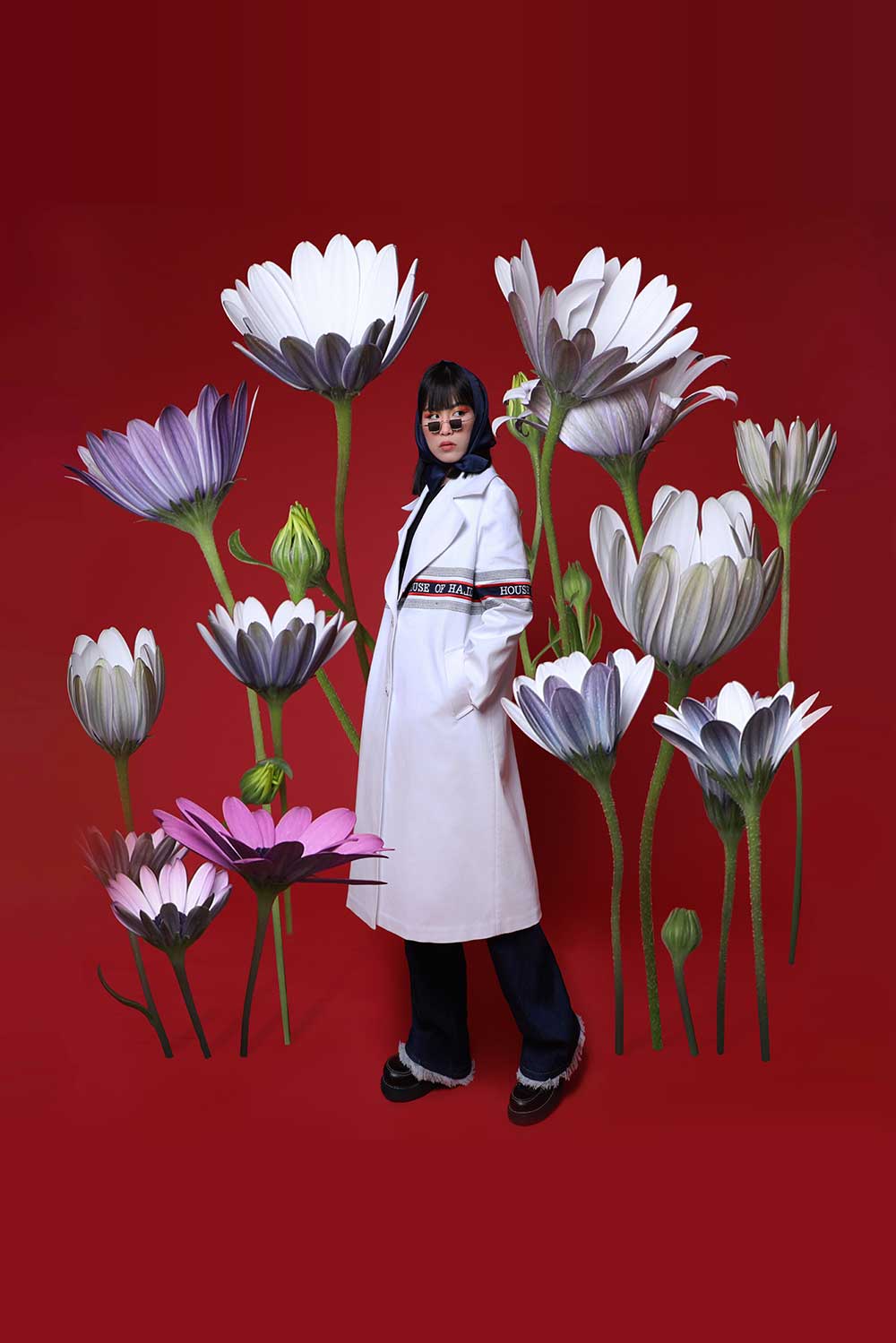 Long white denim coat – with ‘House of Hally’- embroidered around chest and sleeves. Large collared.