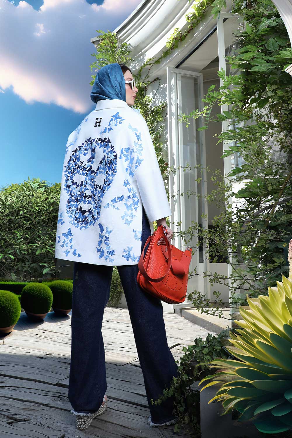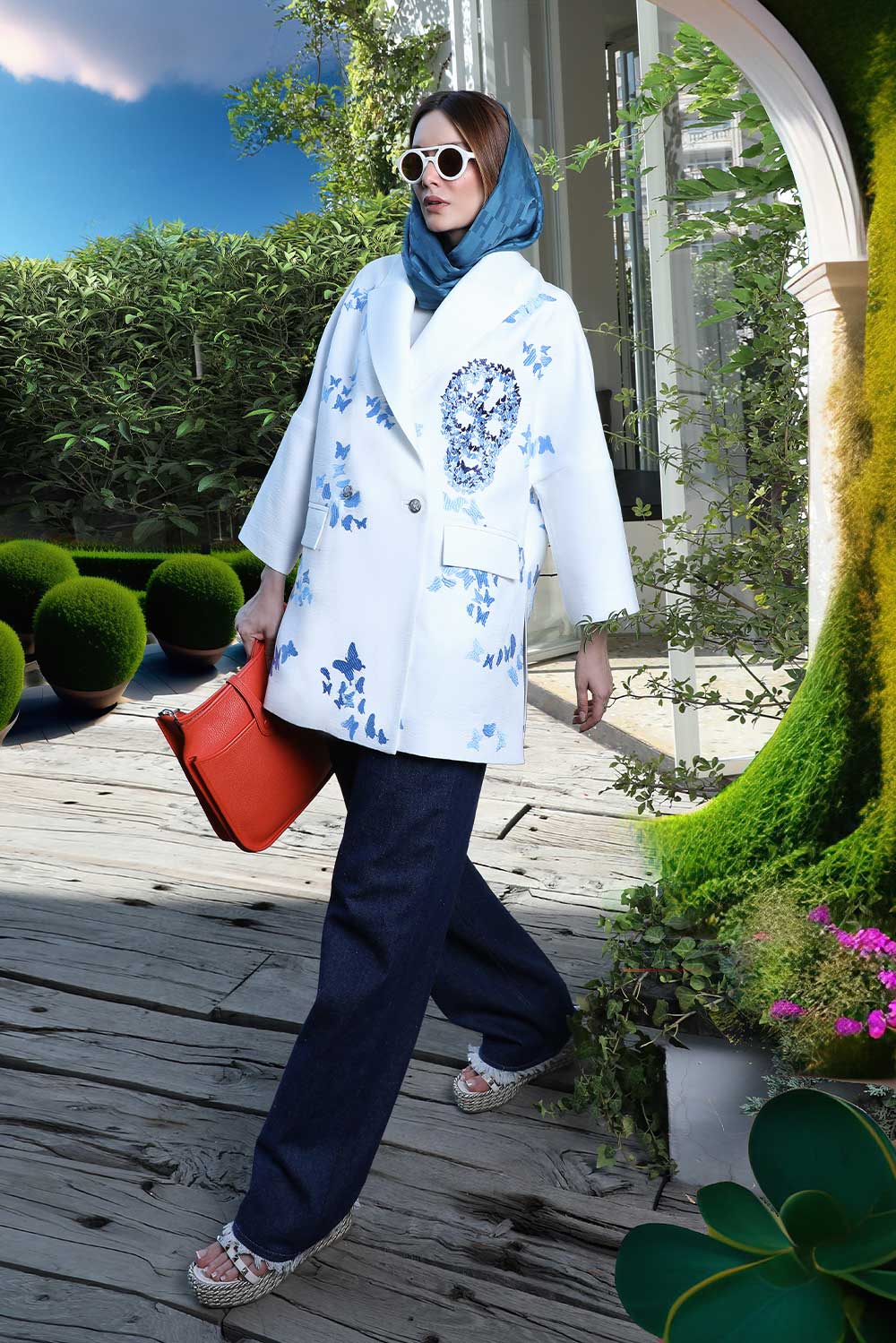 Home202309 Loose fitted white linen jacket double breasted midi – skulls in butterfly design in shades of blue