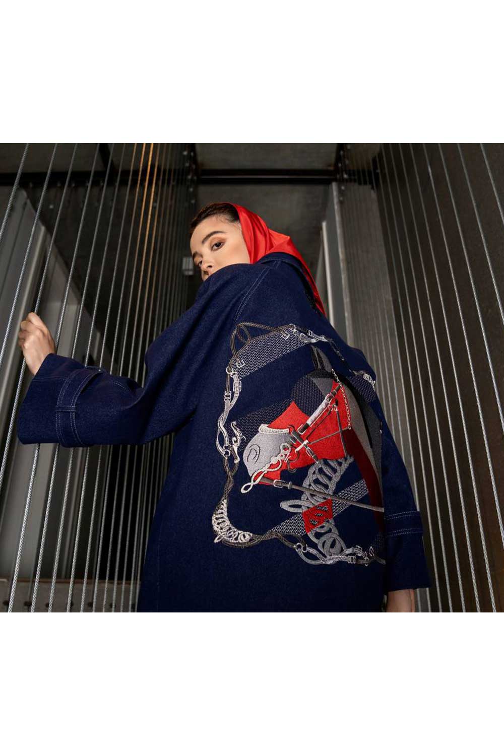 Black knee length rain jacket with blue embroidered belts and chains all over