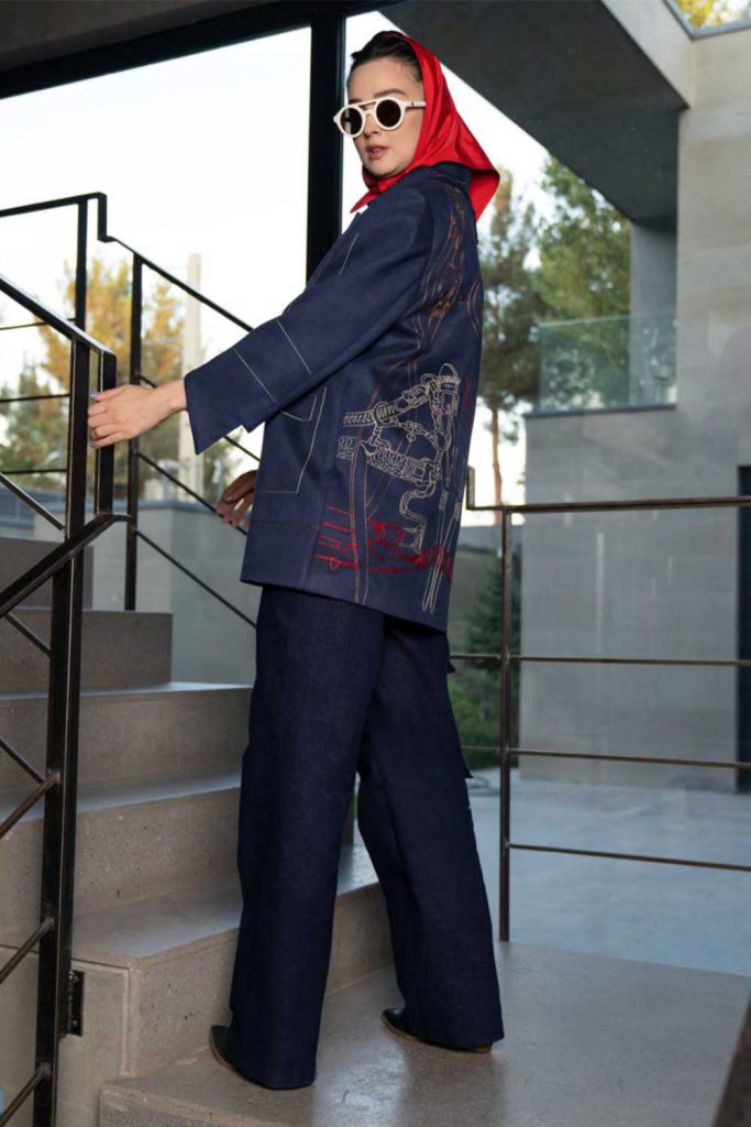 Black mid length jacket with horse head silhouette frame embroidered on back in blue and silver
