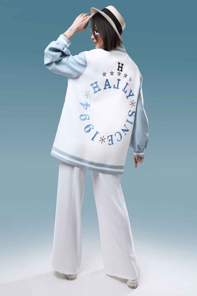 Light oversized linen varsity jacket in pale blue and white- with Palm tree embroidered on front