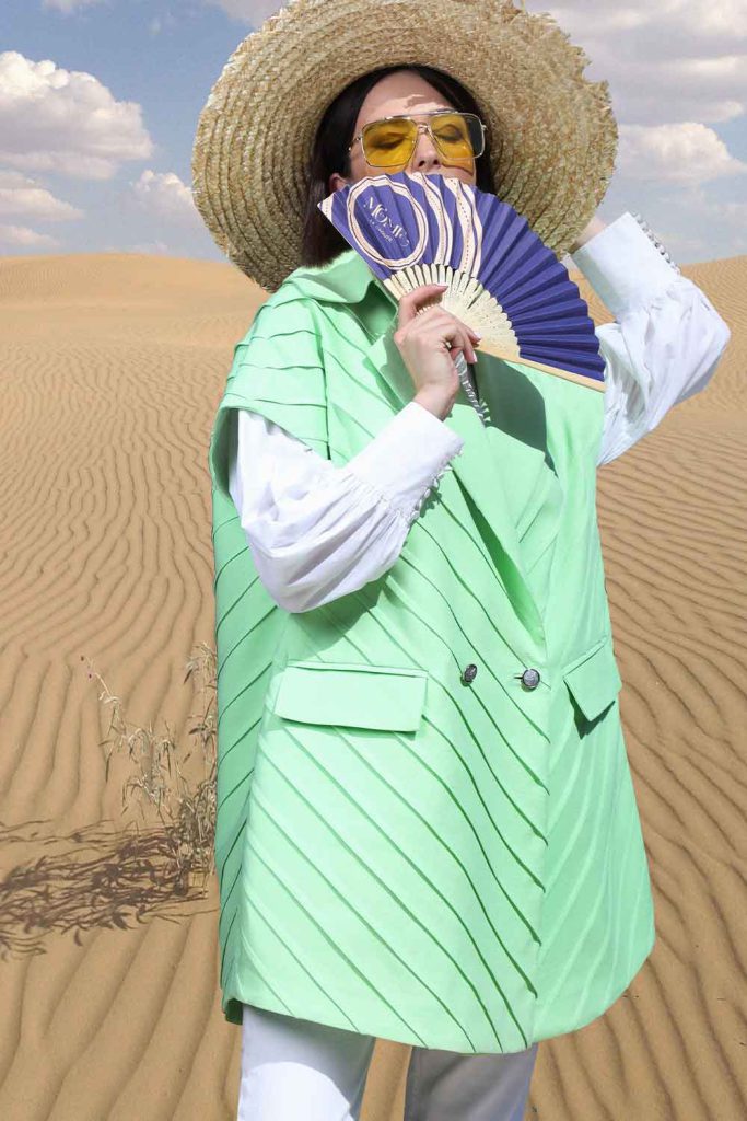 Linen hand pleated light pastel green midi length sleeveless oversized jacket.