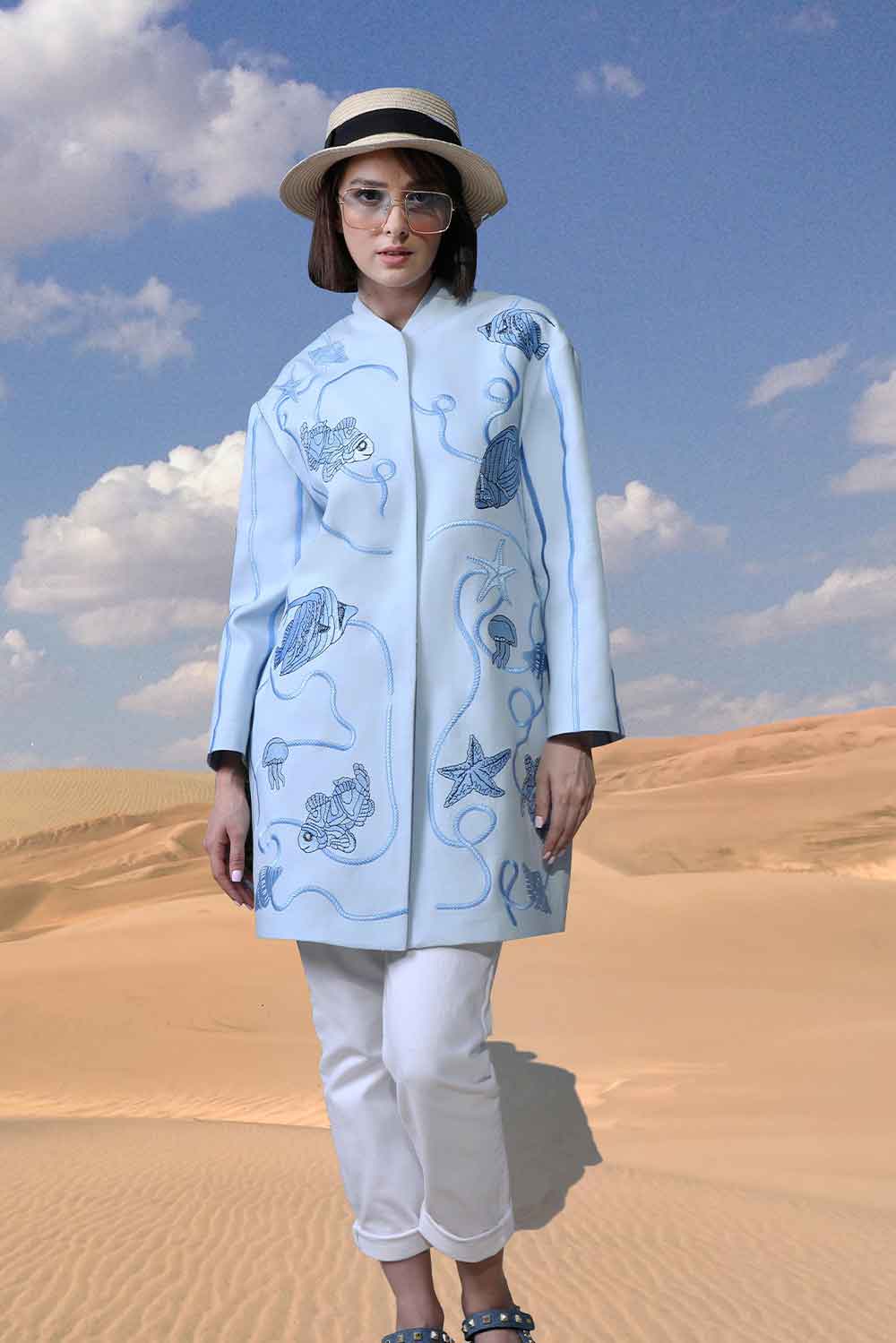Home2023Evocative Collection Mid length light blue jacket with marine life embroidery all over