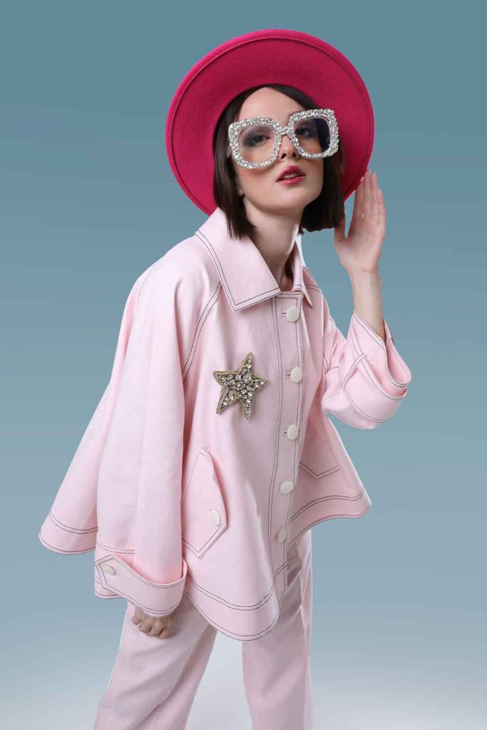 Light blue wide collar short linen jacket with dark short frill detail all around jacket
