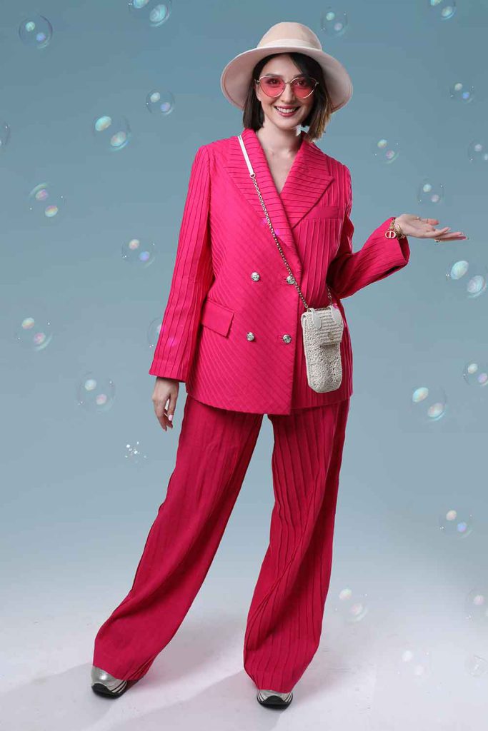 Deep blue linen trouser suit with crop double breasted jacket and sliced trousers