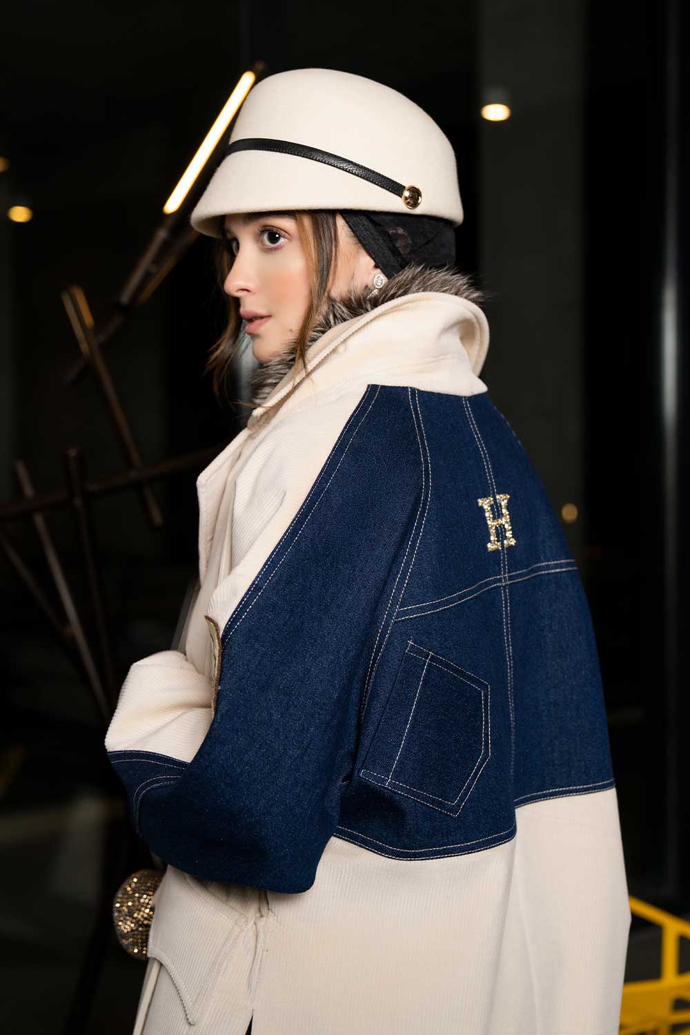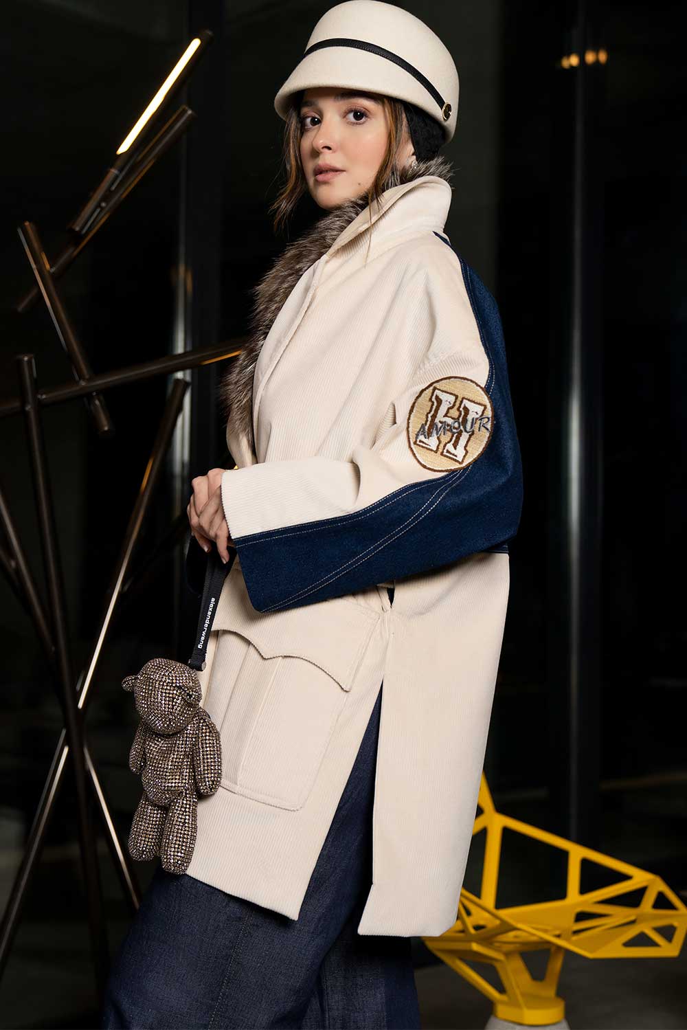Home2024Obsession Collection Midi large pocket creme wool with belt coat with denim jacket back design