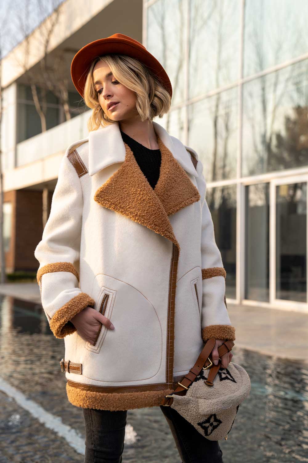Be the first to review “Midi pilots style coat in crème with brown wool detail on collar – sleeves and hem” Cancel reply