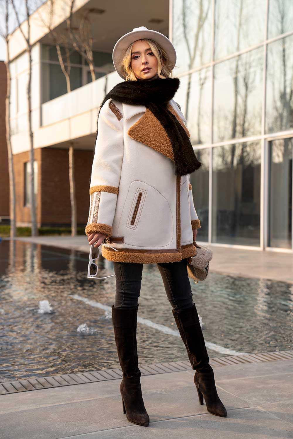 Home2022February Midi pilots style coat in crème with brown wool detail on collar – sleeves and hem