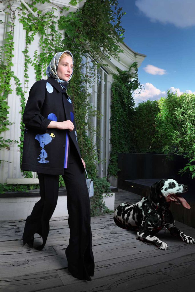 Black linen midi jacket with snoopy embroidered in blue close pleat cuff