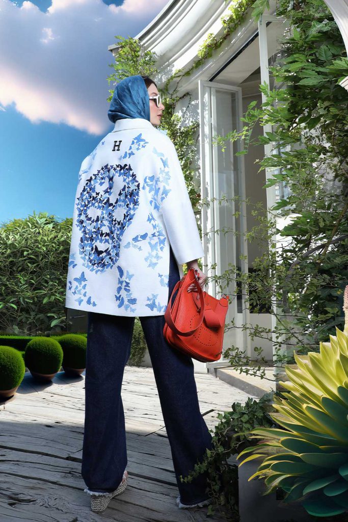 Loose fitted white linen jacket double breasted midi – skulls in butterfly design in shades of blue