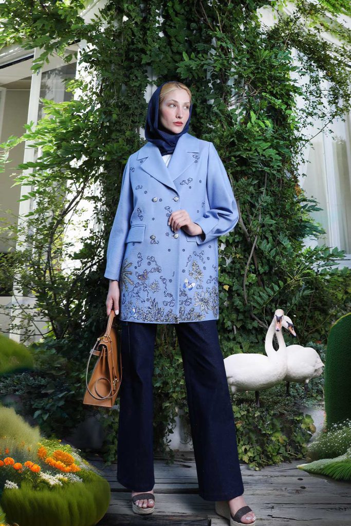 Double breasted light blue jacket with butterflies and follage in blues and grey embroidered