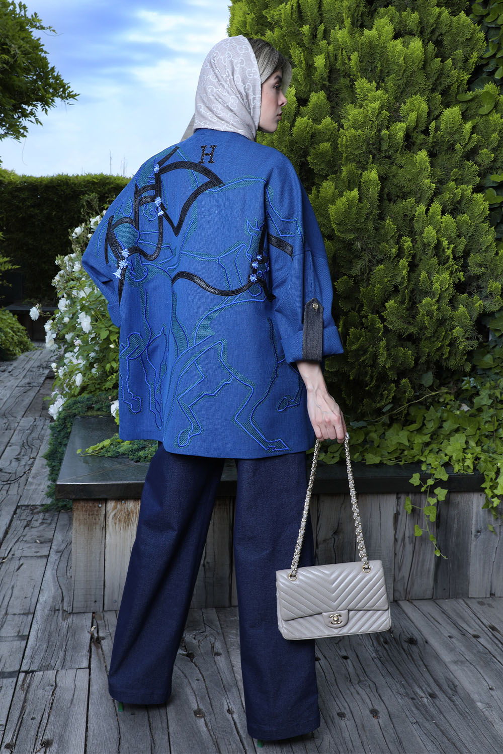 A mid-length coat in white with navy blue and green embroidery on the back