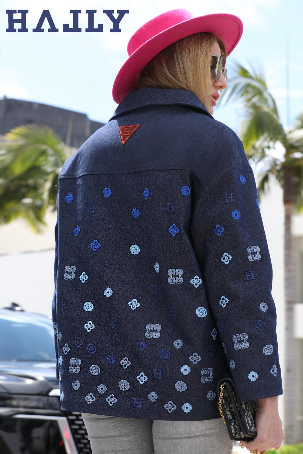 Oversized denim with geometric embroidery, HALLY logo accents, and standout style