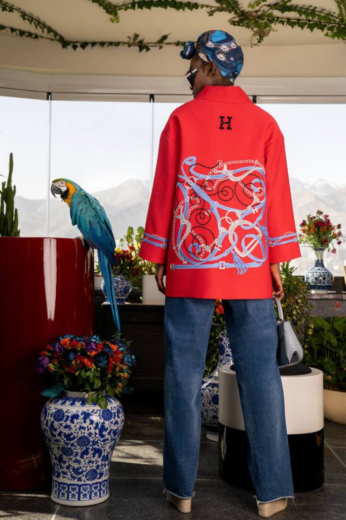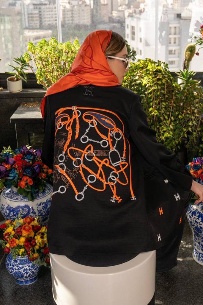 Black jacket with chains and saddle embroidery in orange, brown and silver on back and small embroidered H’s on the front