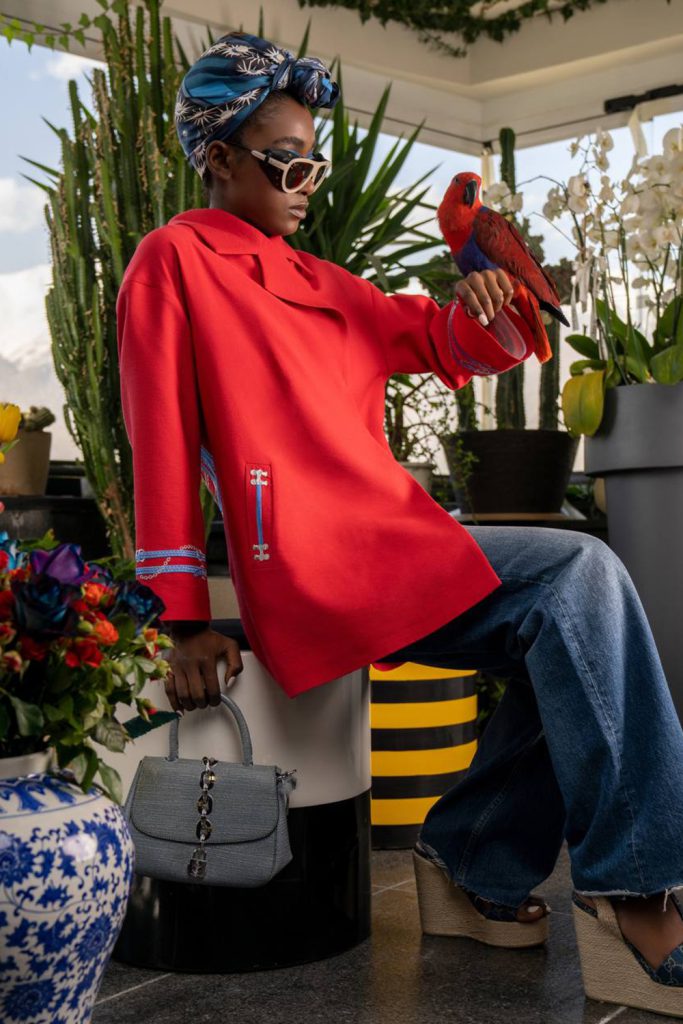 Couture red spring jacket with embroidery in blue on cuffs and pockets-horse accessory embroidery on back in white, blue and navy.