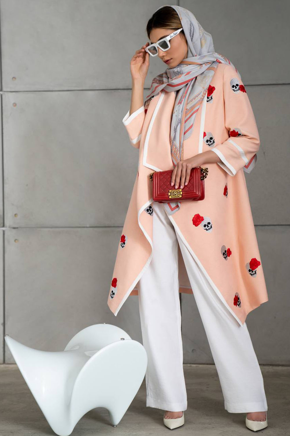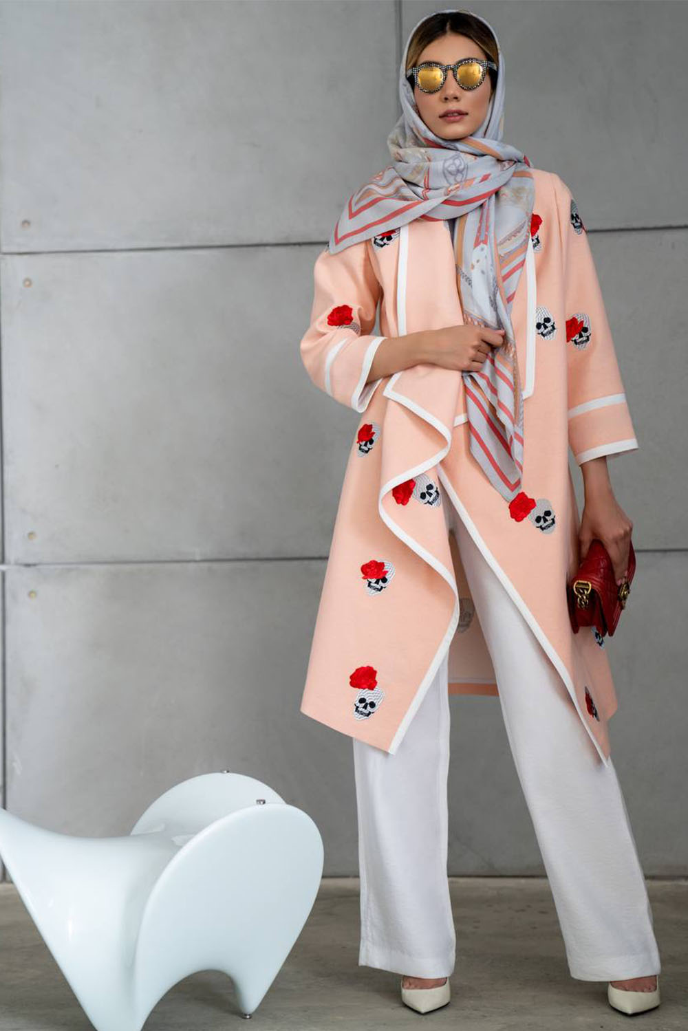 Peachy knee length coat with grey and blue flower and skull embroidery all over