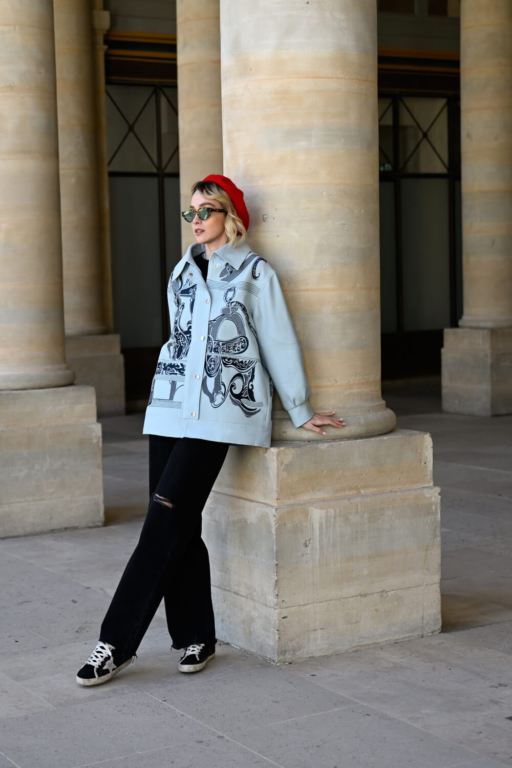 Powder blue linen jacket featuring tonal navy embroidery with equestrian motifs