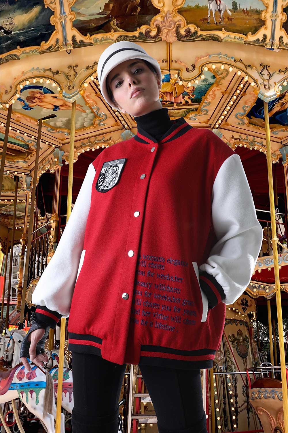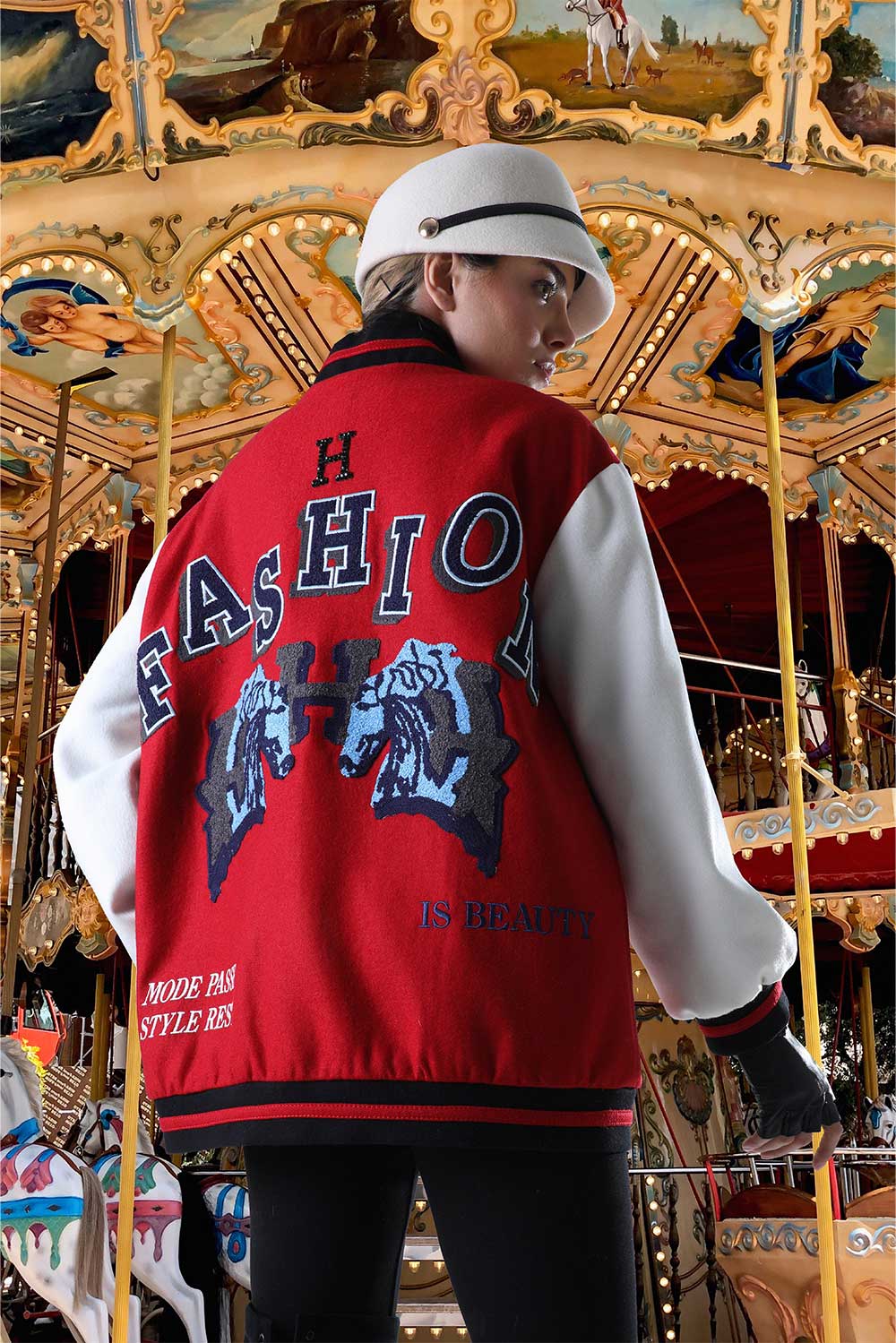 Home2024Allure collection Red and white sleeve varsity jacket and double horse head embroidered on back
