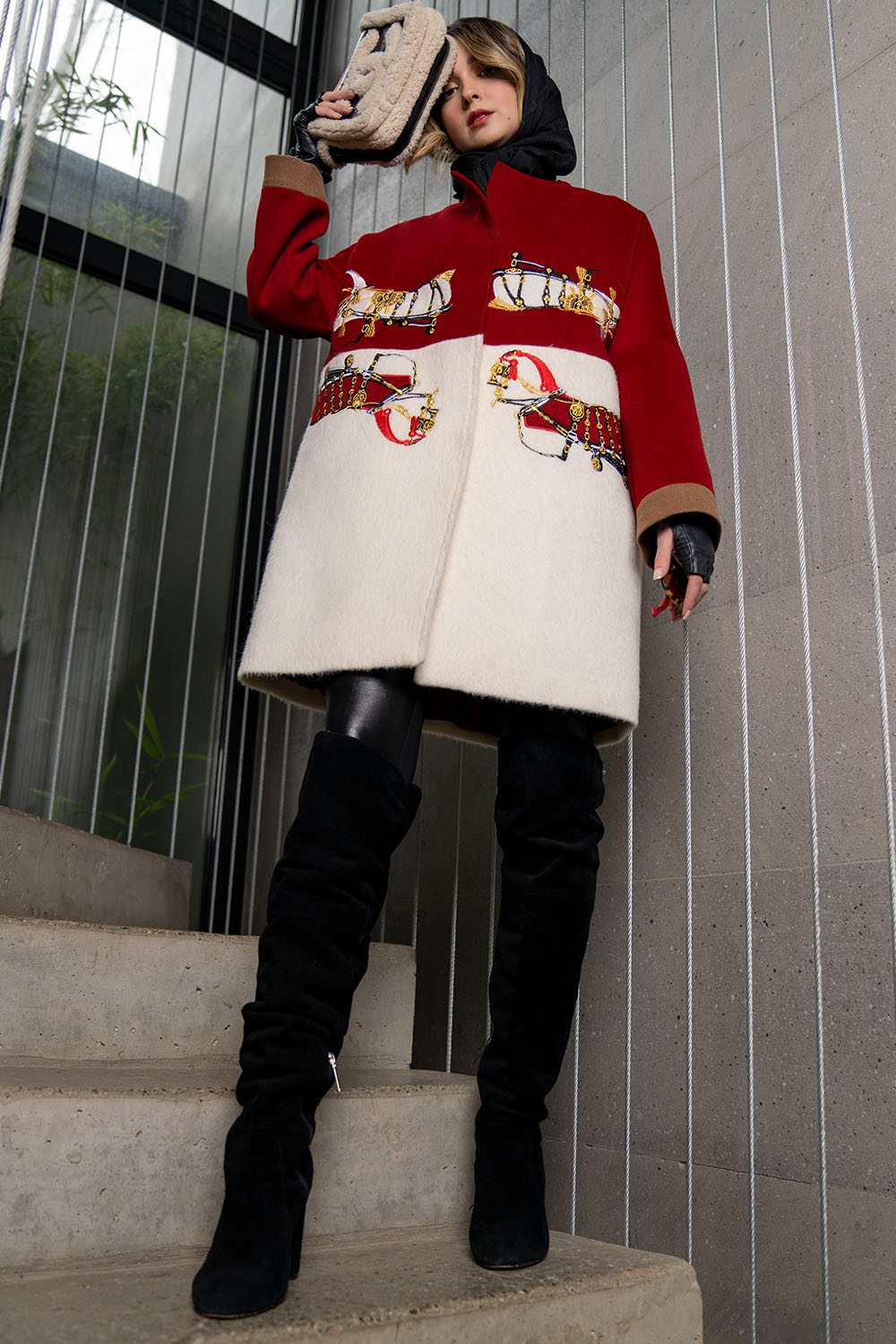 Red and white wool midi coat with royal mirrored horses embroidered on front