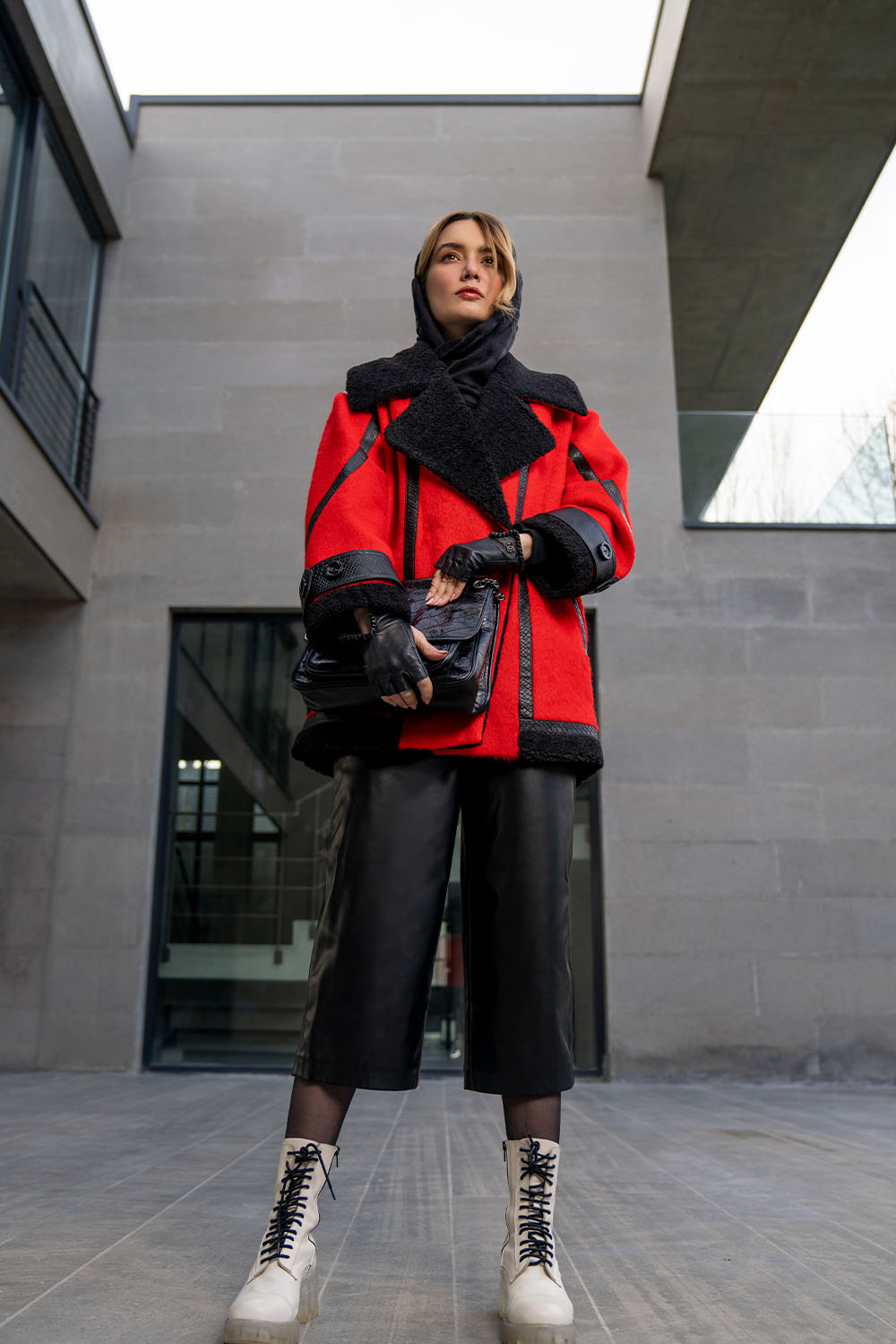 Red wool jacket with leather trim and detail on cuffs, hem and black large wool collar