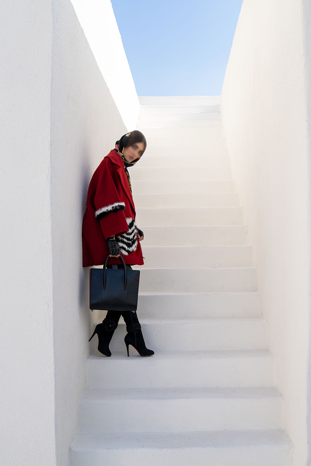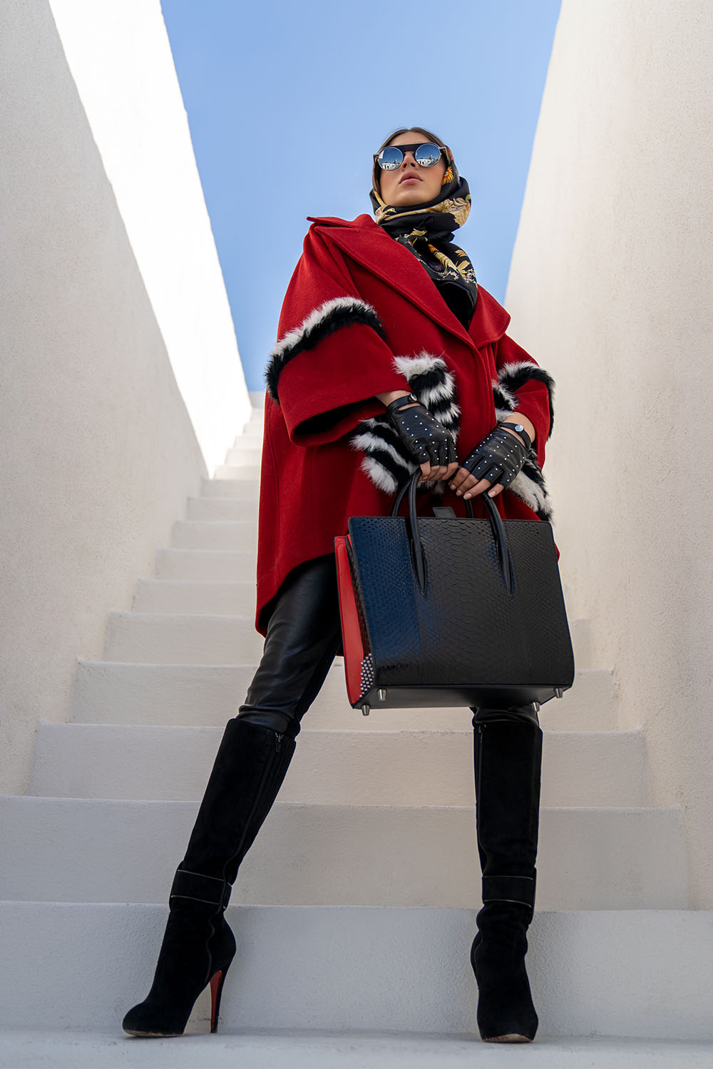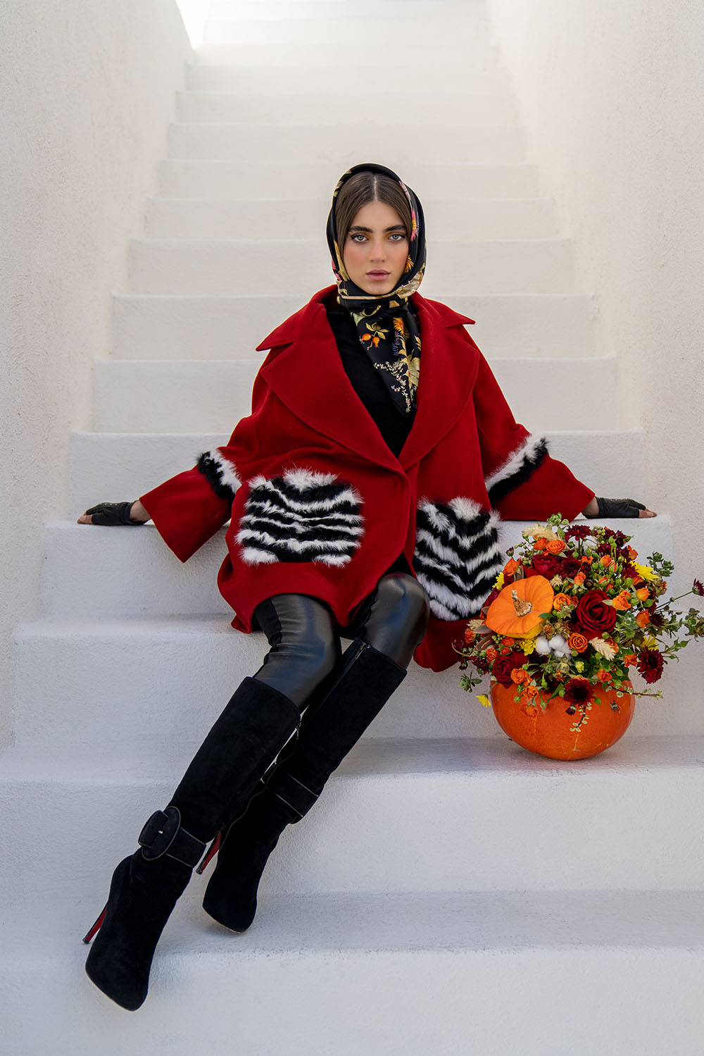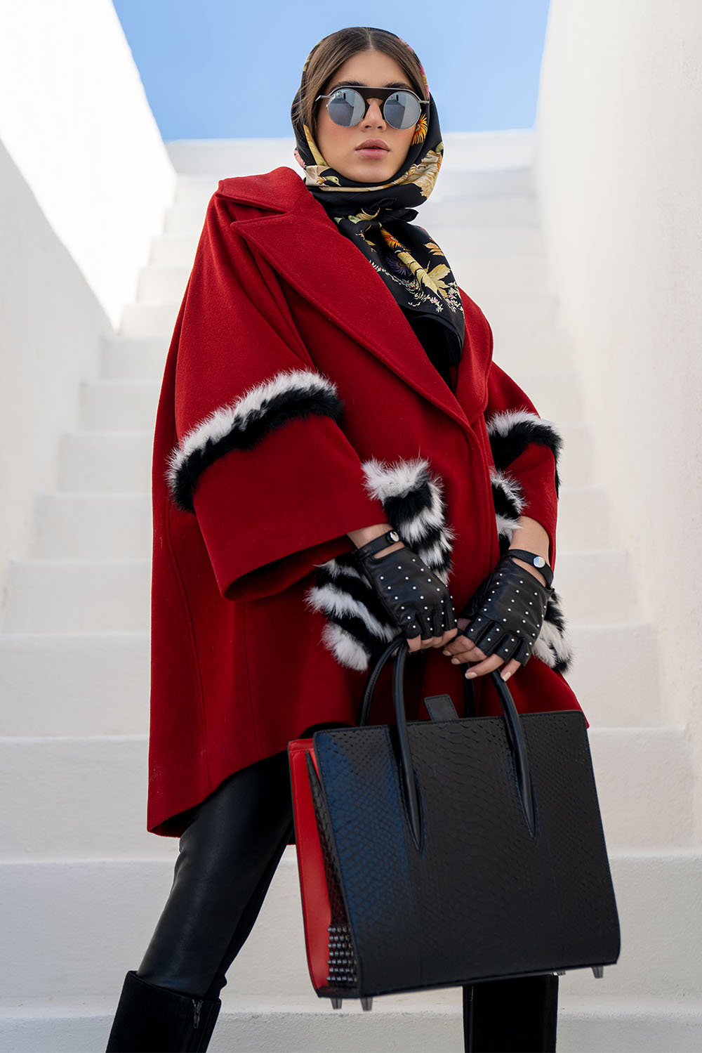 Home2021October Red wool swing coat midi coat. Black and white fur detail on sleeves and pockets