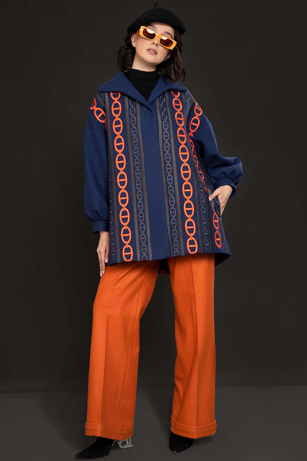 Royal blue mid length coat – chain embroidery running down in orange satin and dark grey
