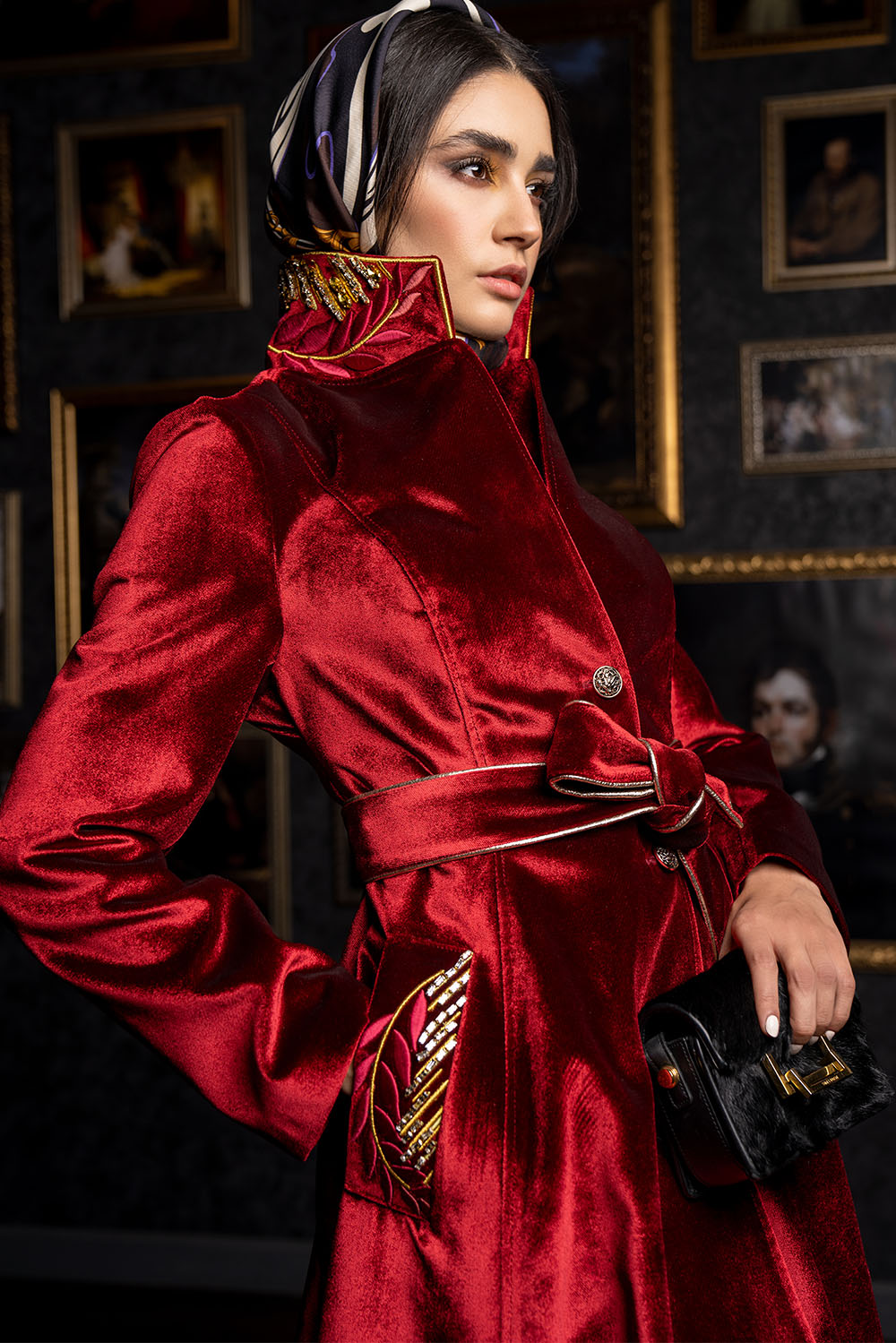 Home2021October Royal red shiny velvet coat with belt – embroidery of leaves on cuffs and collar in gold and red satin