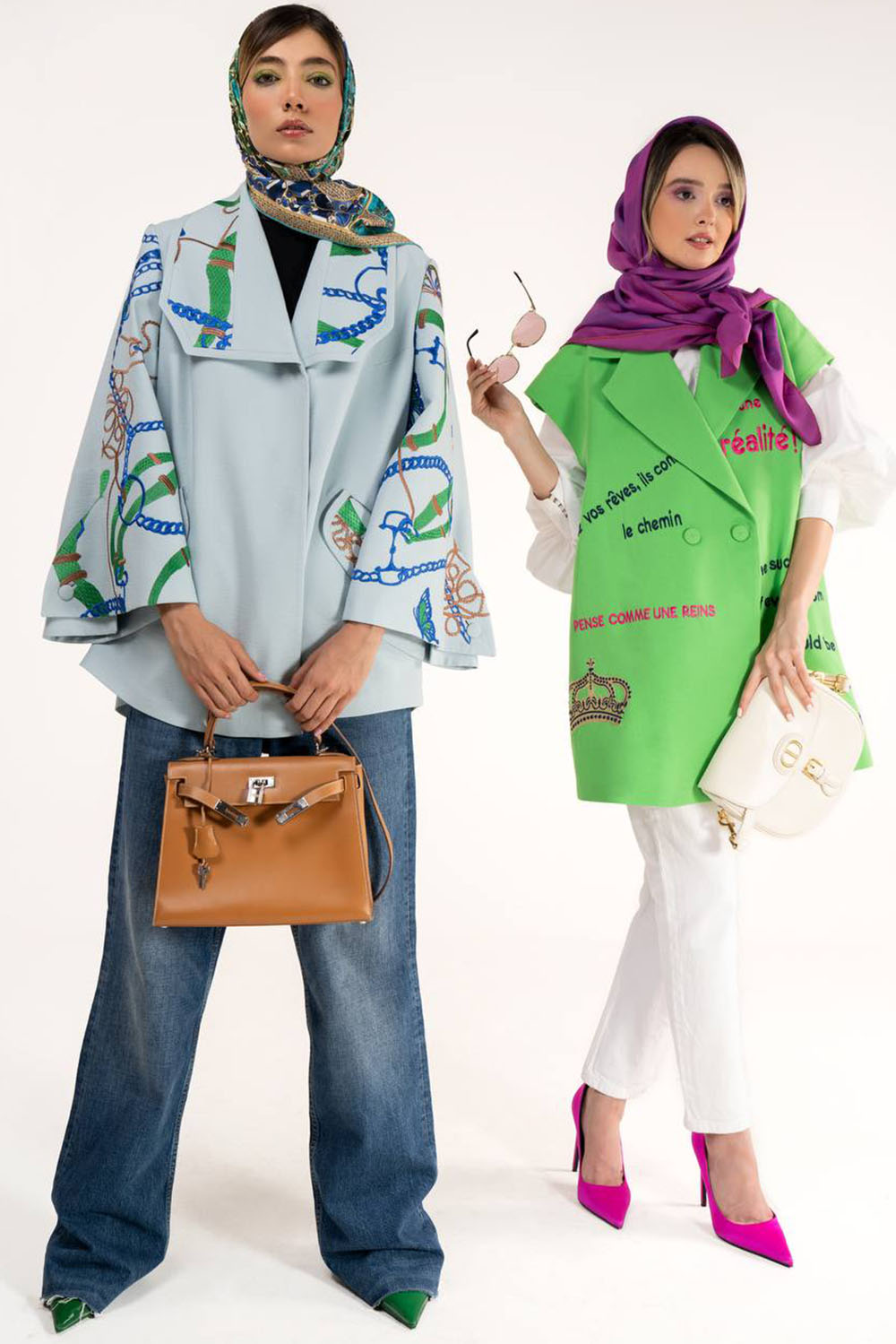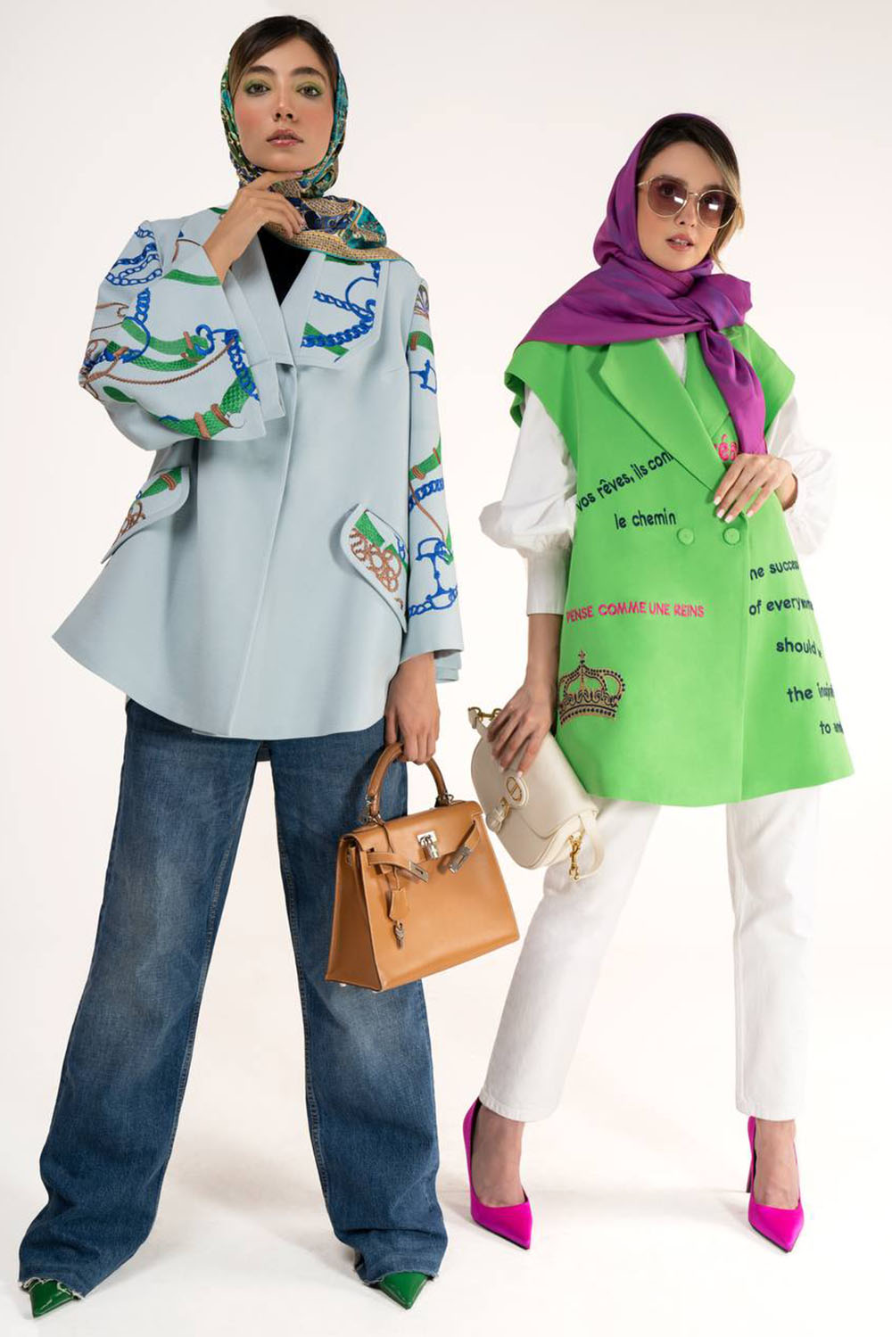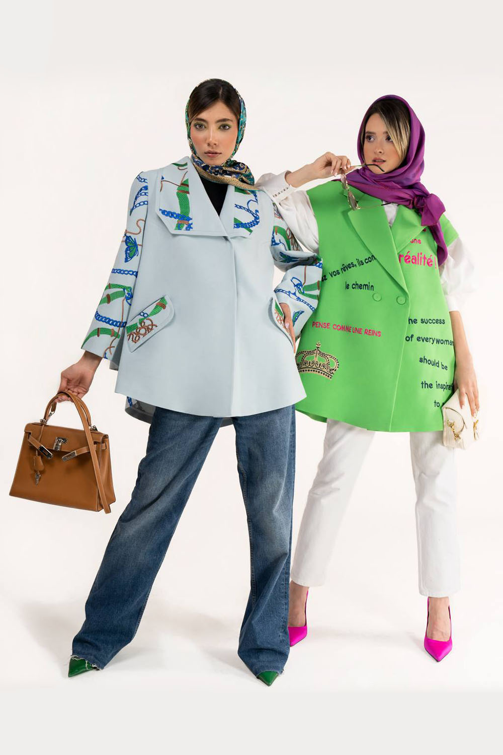 Knee length waist coat in neon green with fuscia and blue embroidered quotes . Crown and Diamond to right side