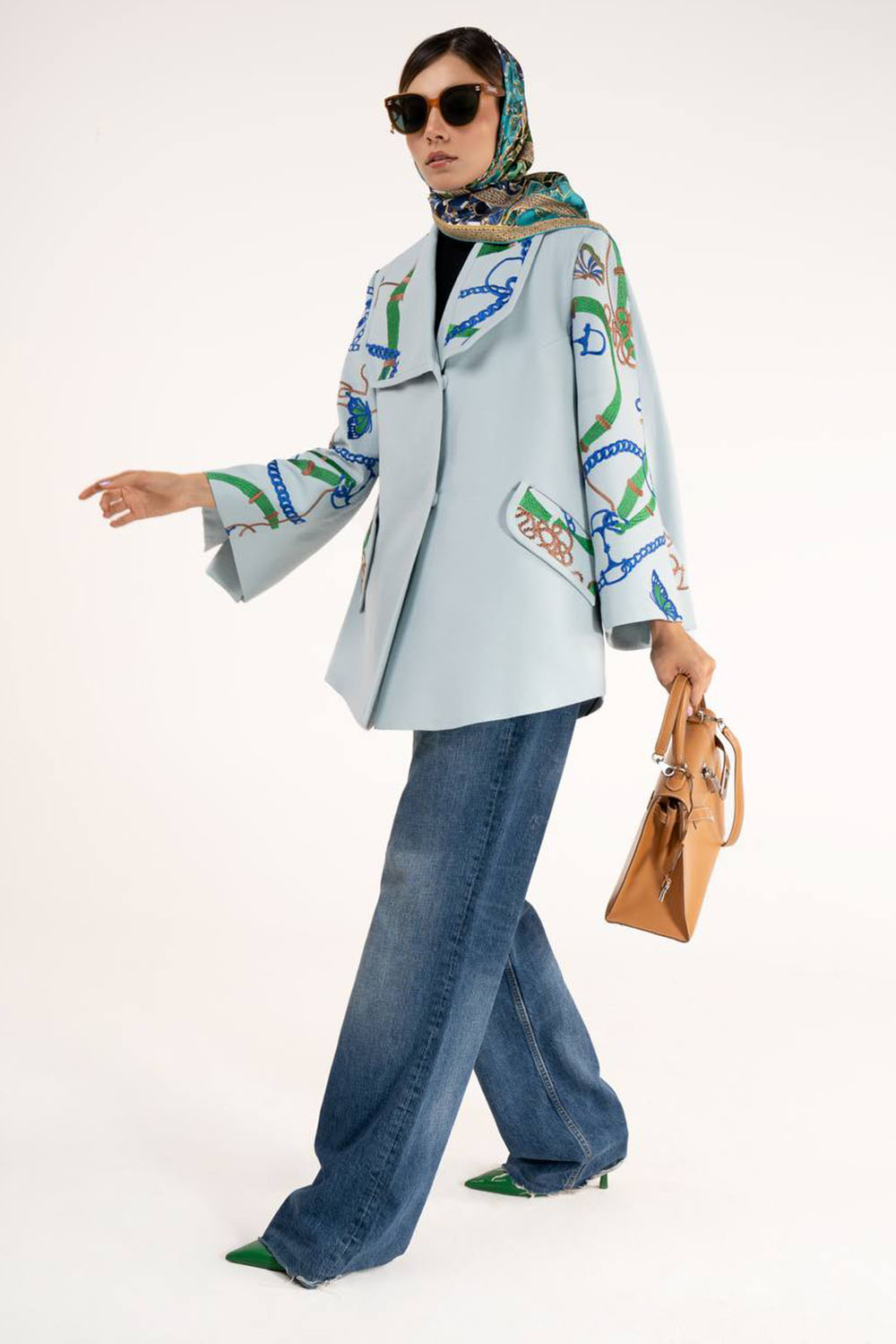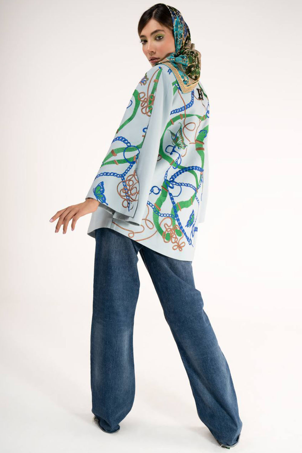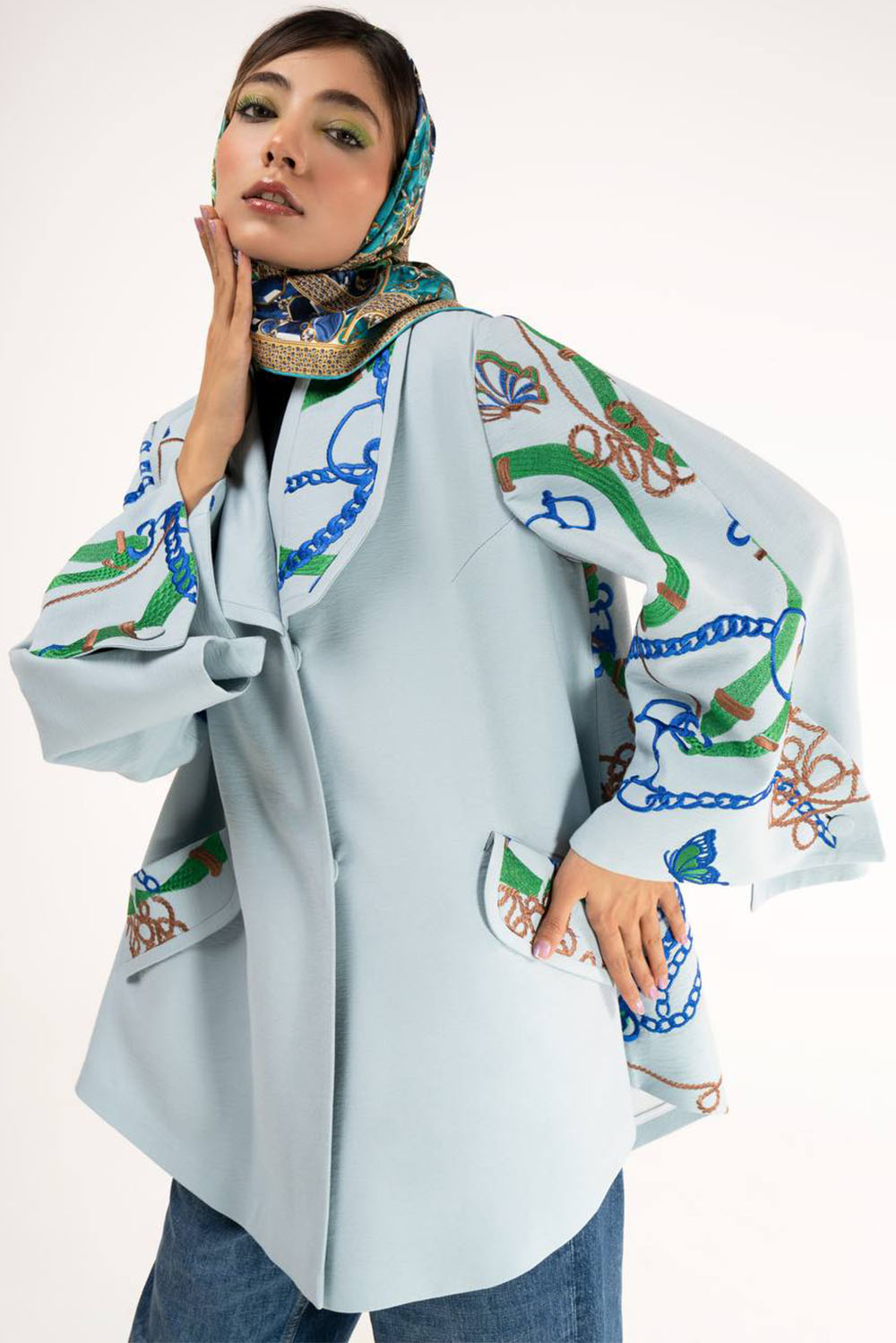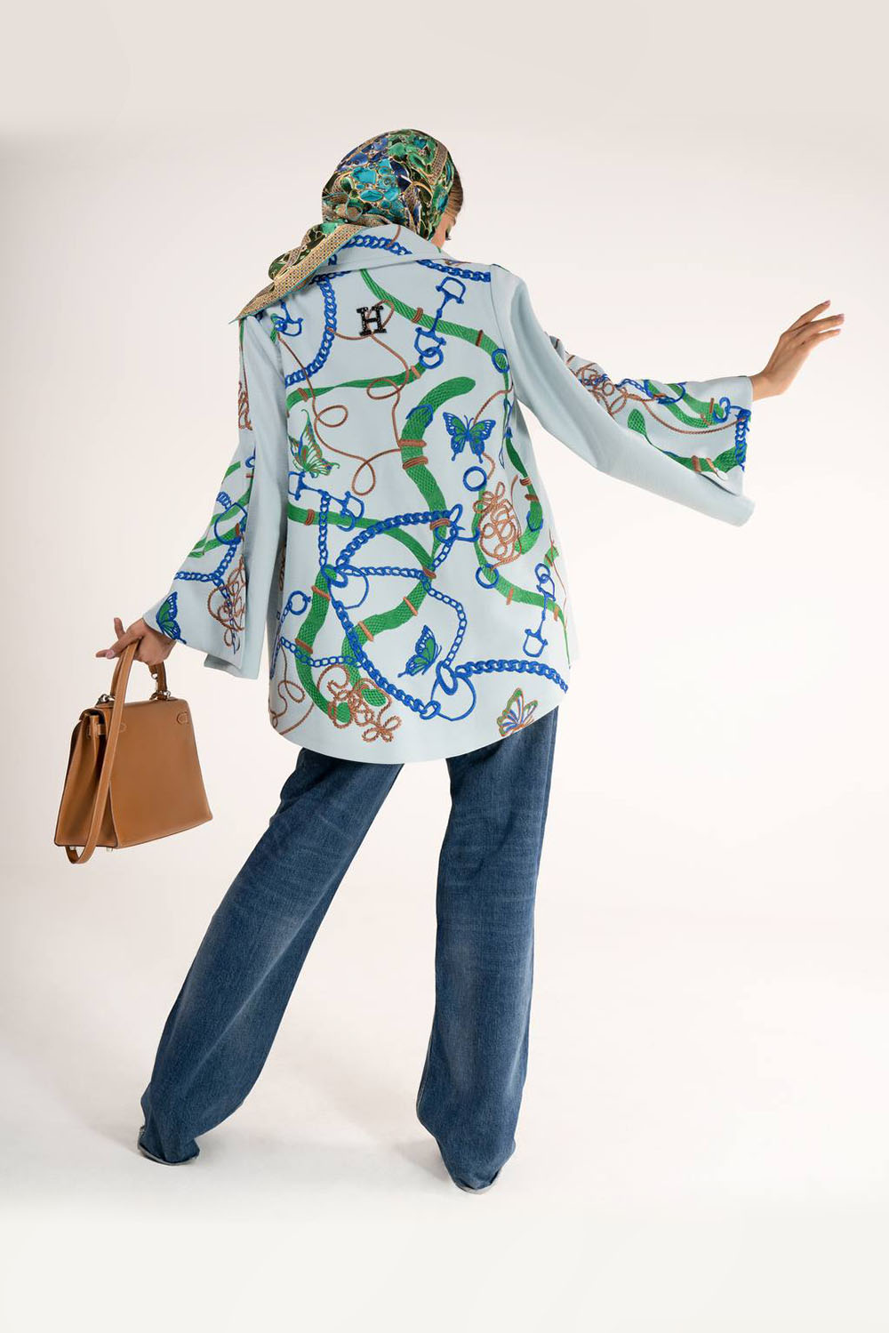 Home2022June Short light blue swing coat with belts, chains and butterfly embroidery all over in blue/green/brown