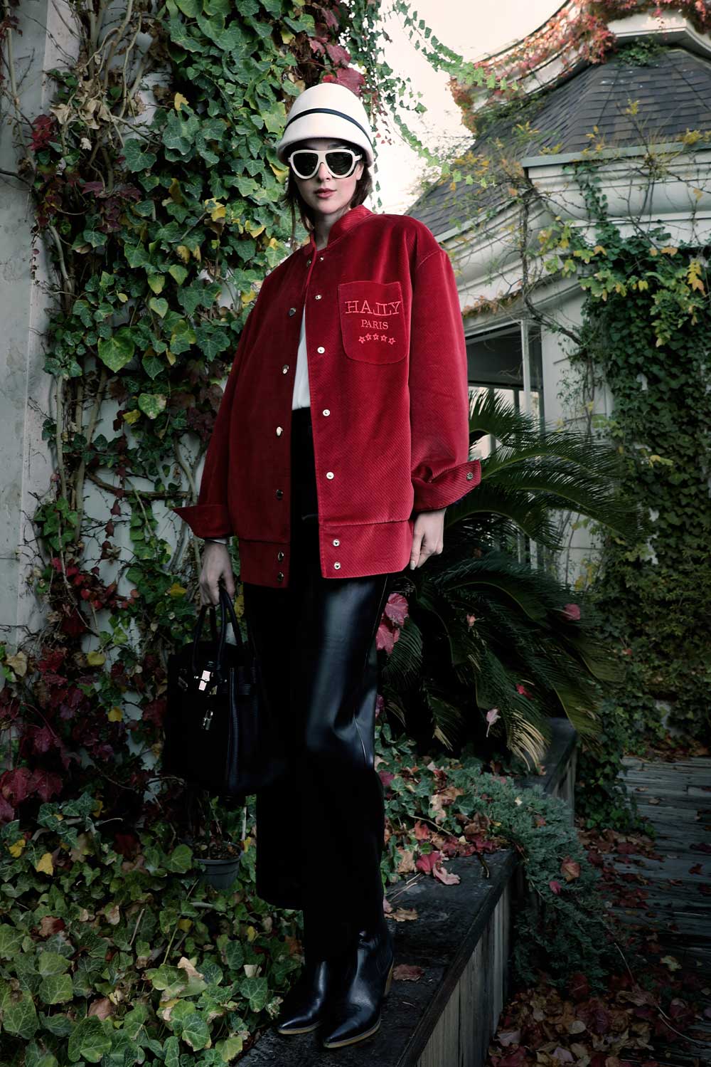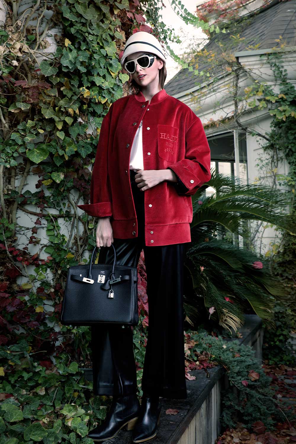 Signature autumn velvet jacket in cardinal red with meticulous top stitching