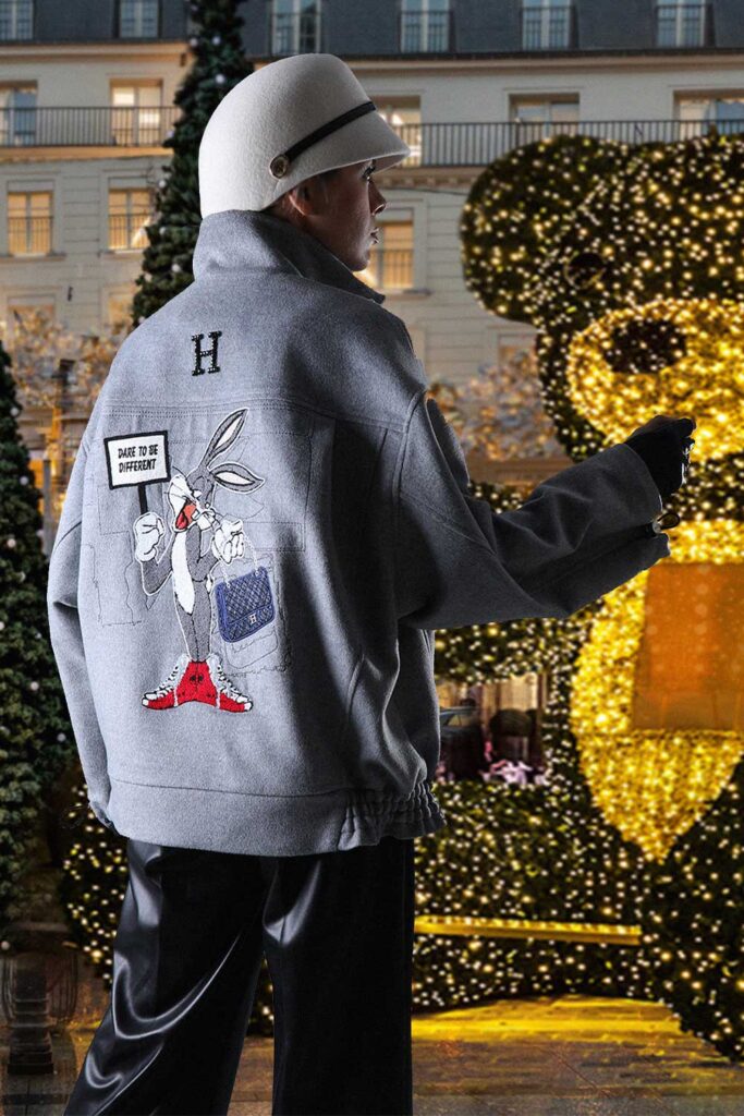 Long off white varsity jacket with mini fluffy teddies embellished all over