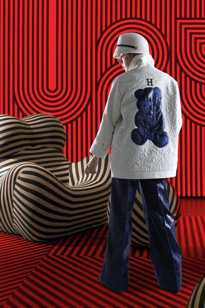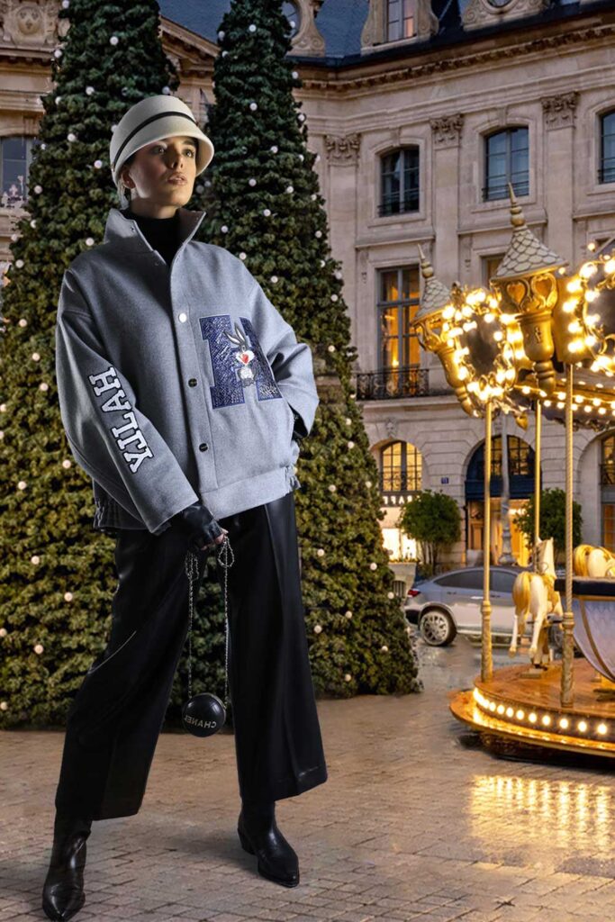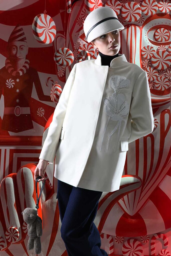 Home2024Allure collection Single breasted white wool midi jacket with grey patterned teddies embellished all over
