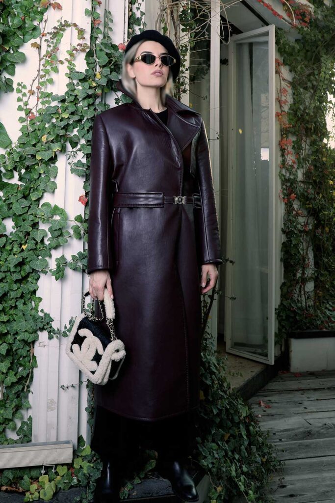Bordeaux leather coat with luxurious texture and flattering waist belt.