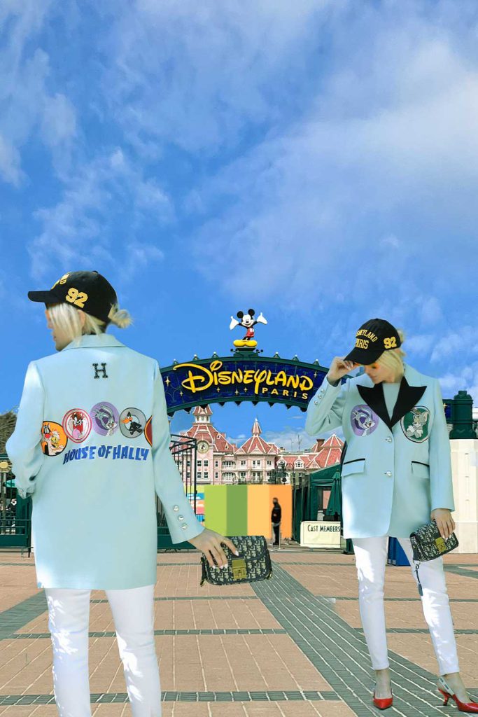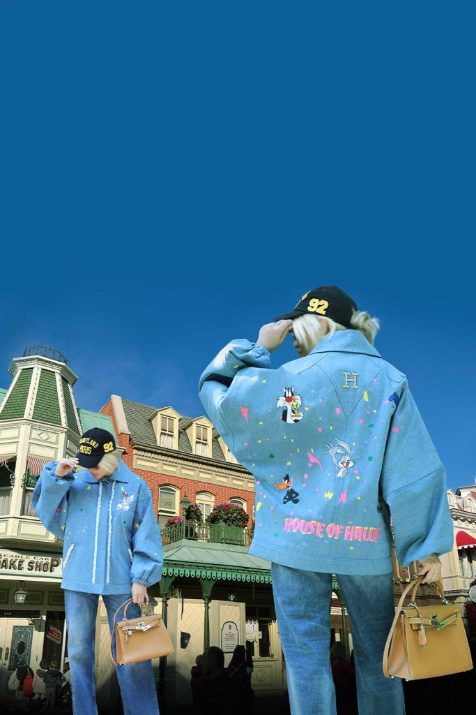 Midi length single breasted jacket in light blue- with black collar- Loony tune character embroidered on back above ‘House of HALLY’.