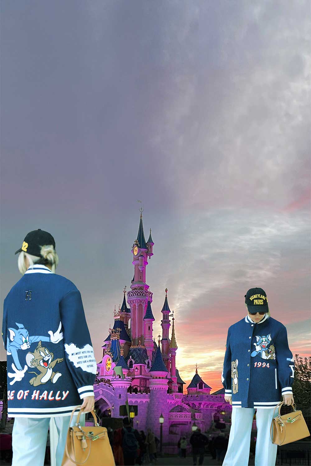 Light green varsity jacket with white sleeves – Donald Duck with French flag on back and Micky on front