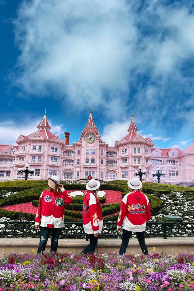 Cranberry red denim varsity jacket with ‘House of HALLY’ Micky Mouse embroidered on back