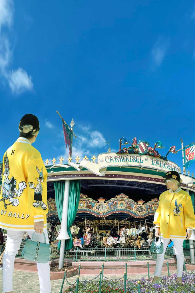 Canary yellow ‘House of Hally’ varsity jacket with Bugs Bunny director embroidered on back