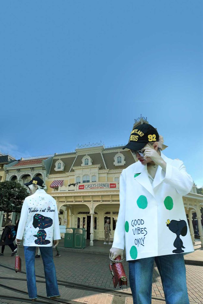 Snoopy embroidered on front and back on white single breasted jacket. Light green circles on front