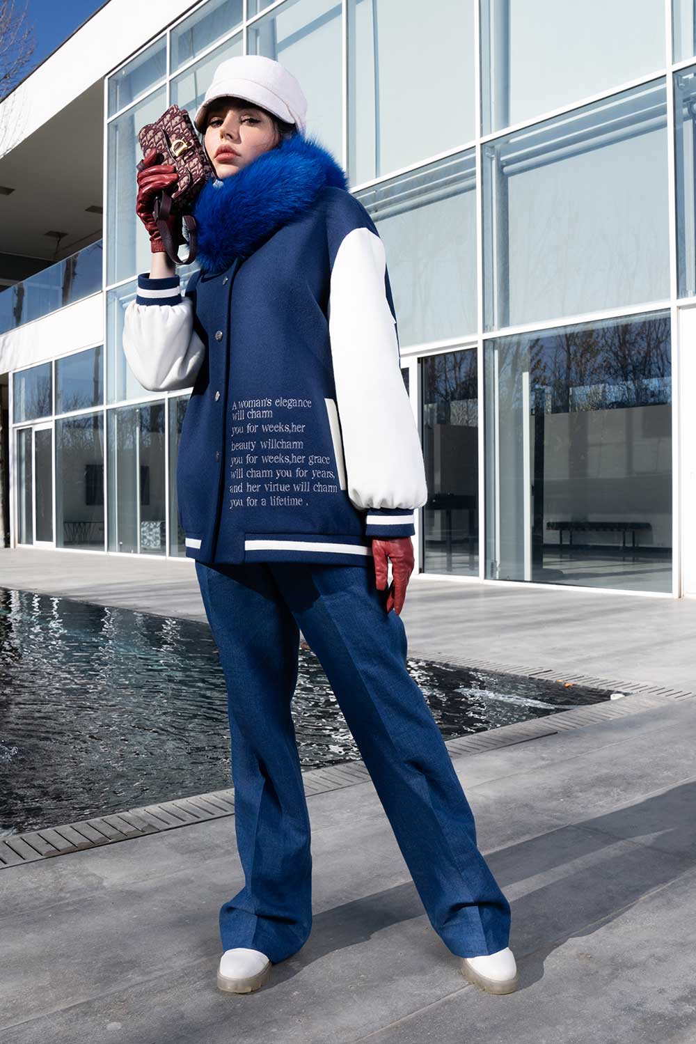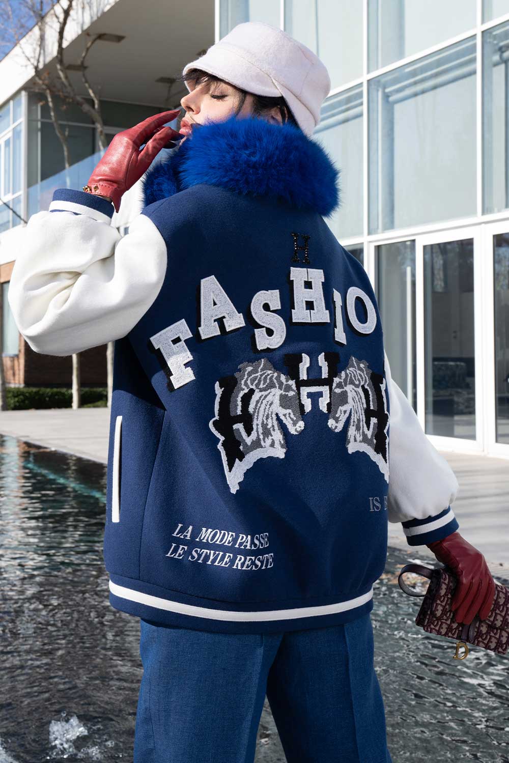 Home2024Obsession Collection Varsity jacket in blue with fashion horse embellished on back and white sleeves
