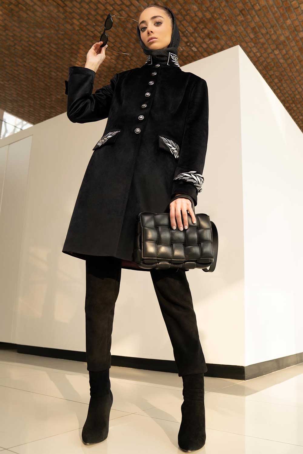 Midi wool coat in black with multi coloured symbol embroidery