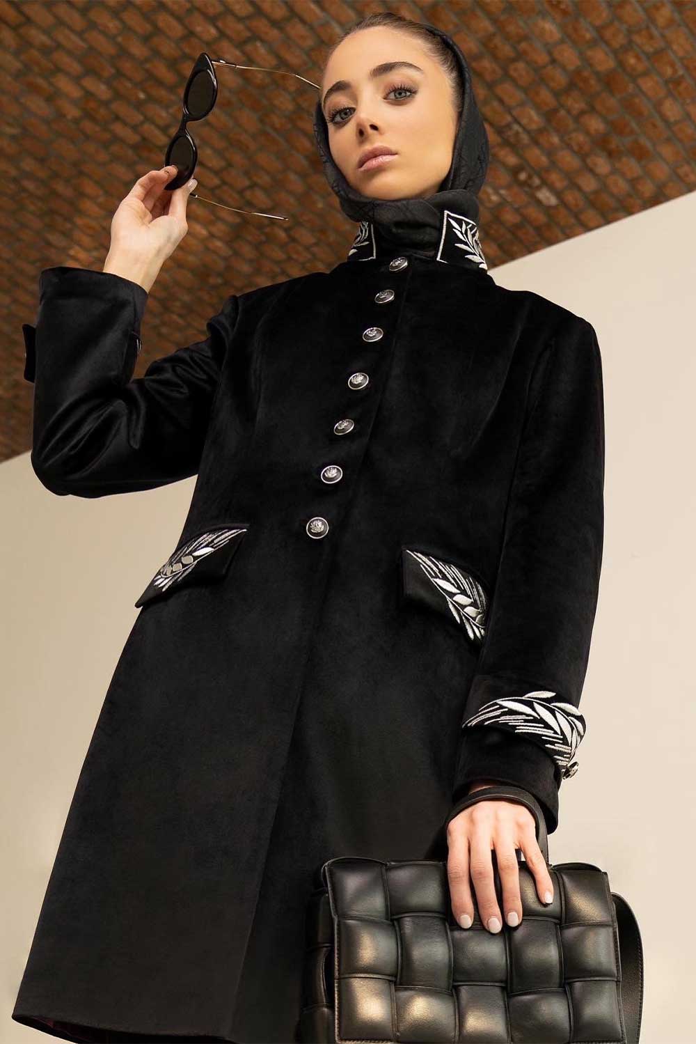 Be the first to review “Velvet medium jacket with standing embroidered collar, cuffs and pocket in silver with buttons running down” Cancel reply