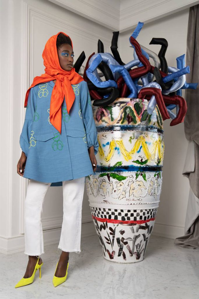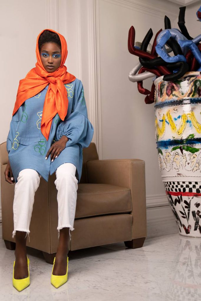 Mid length jacket in bright sky blue with eye embroidery in gold and navy