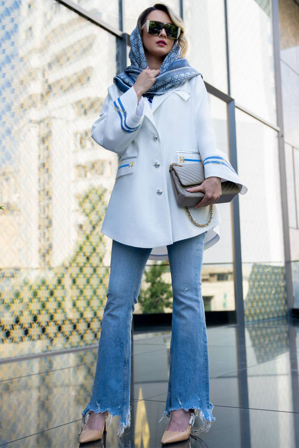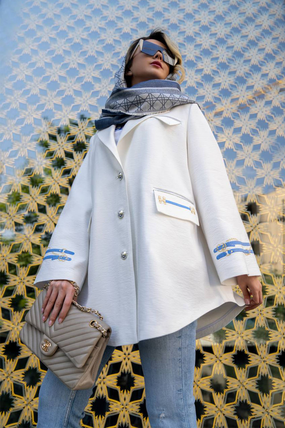 Be the first to review “White below waist jacket with stirrups and chains embroidery on back in light blue and gold” Cancel reply