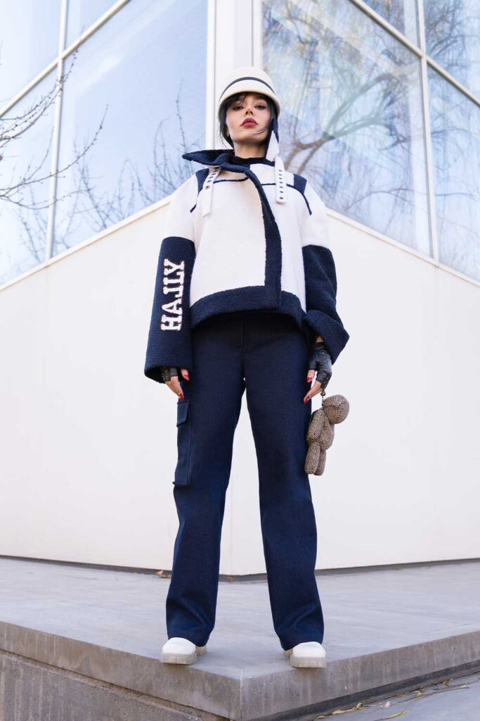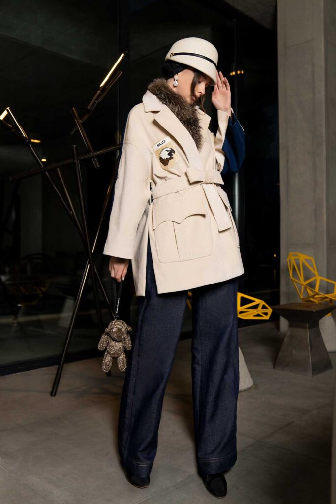 Short cropped cashmere jacket with a pilot collar in blue and white with Teddy on back