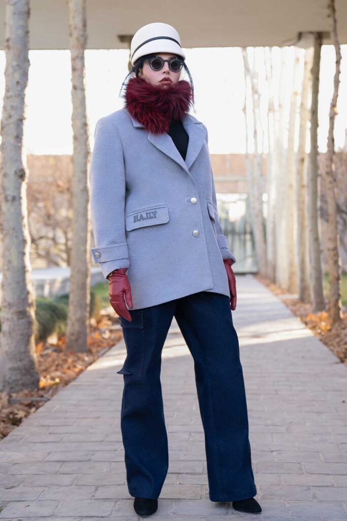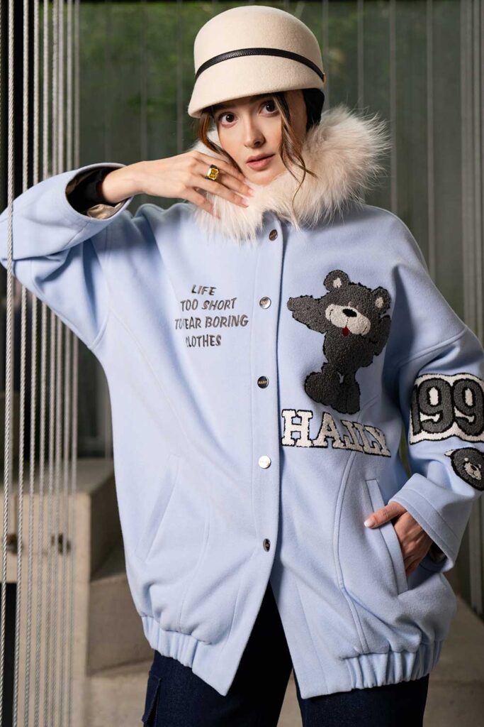 Grey Teddy embossed HALLY pastel blue jacket with fur collar