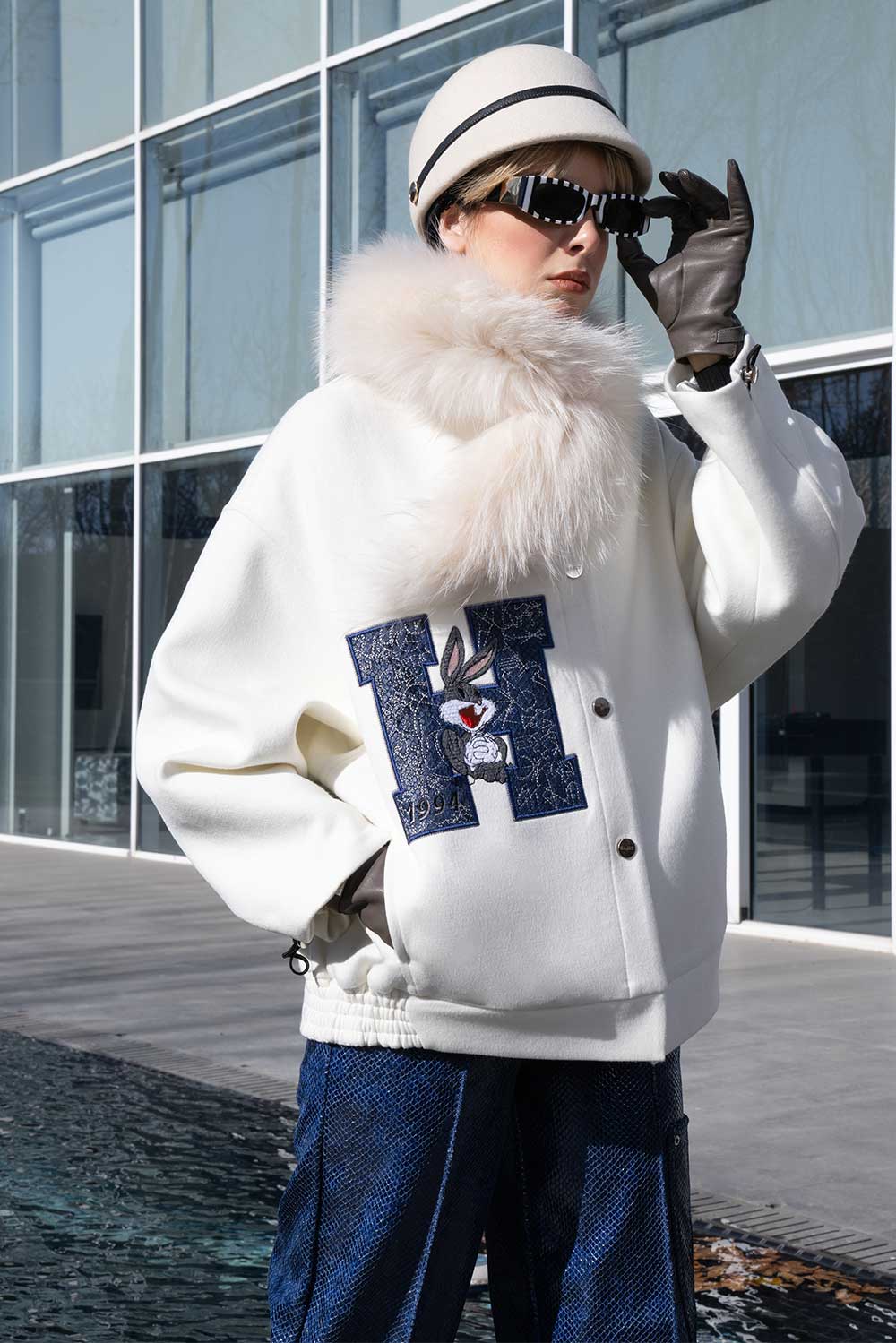 Home2024Obsession Collection White cashmere jacket with bunny embossed on back and drawstring sleeves