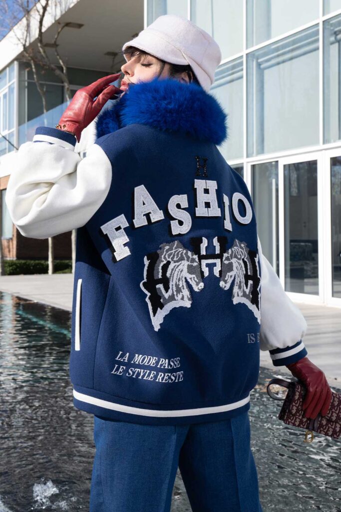 Varsity jacket in blue with fashion horse embellished on back and white sleeves