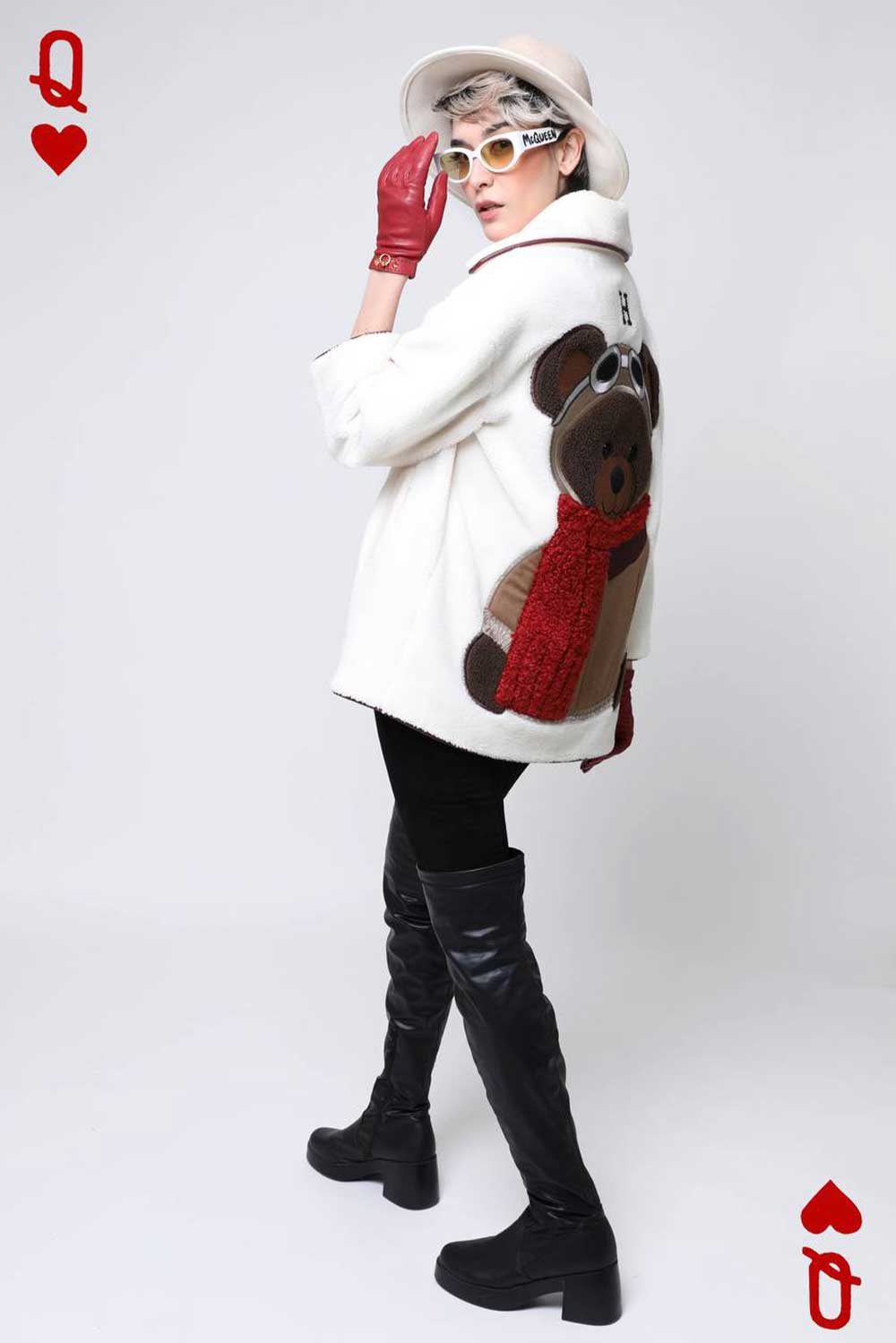 Home2023valentine2023 White creme cashmere jacket with large flying pilot Teddy embellished on back.
