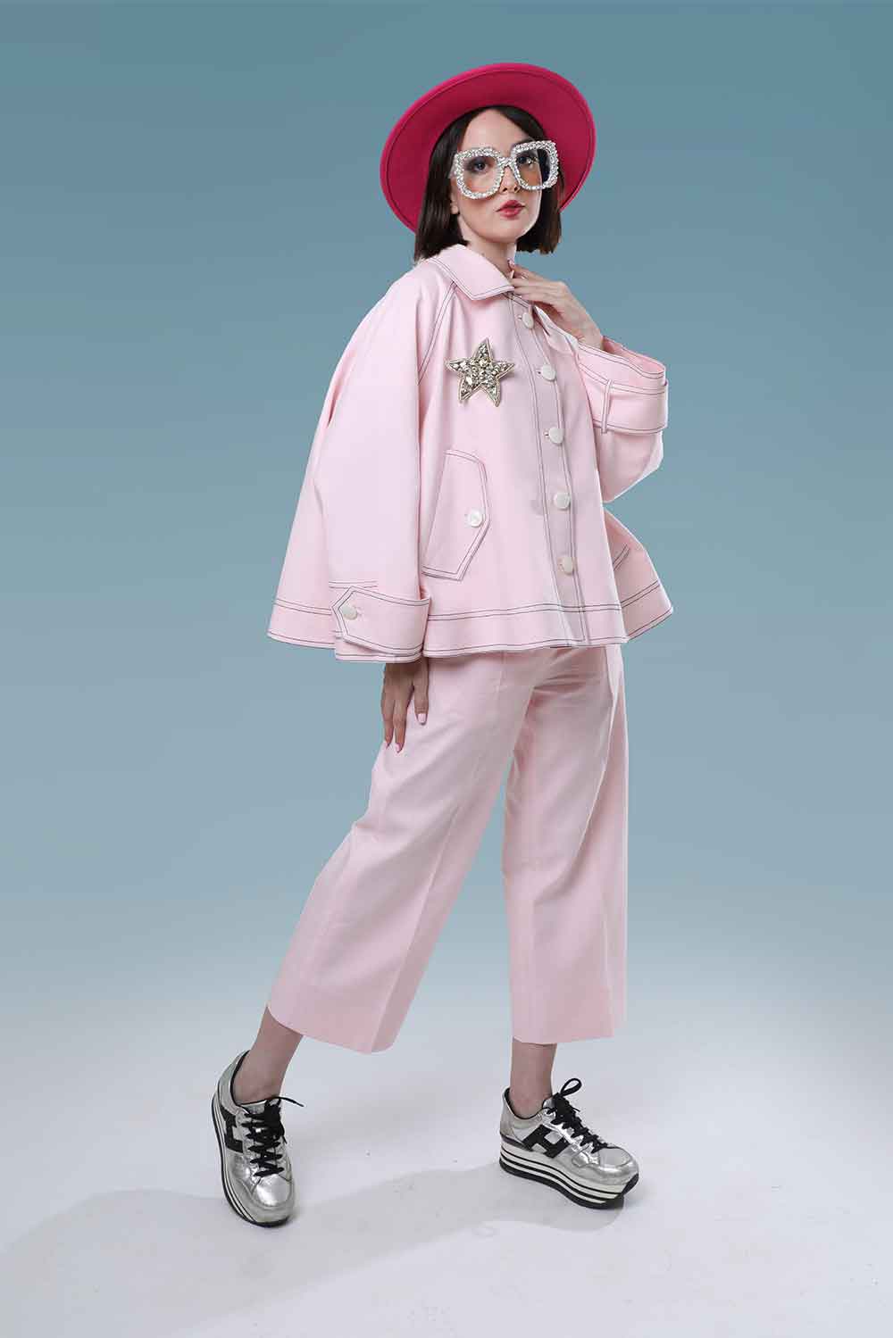 Home2023Evocative Collection Wide cuff -waist length pastel pink trouser suit